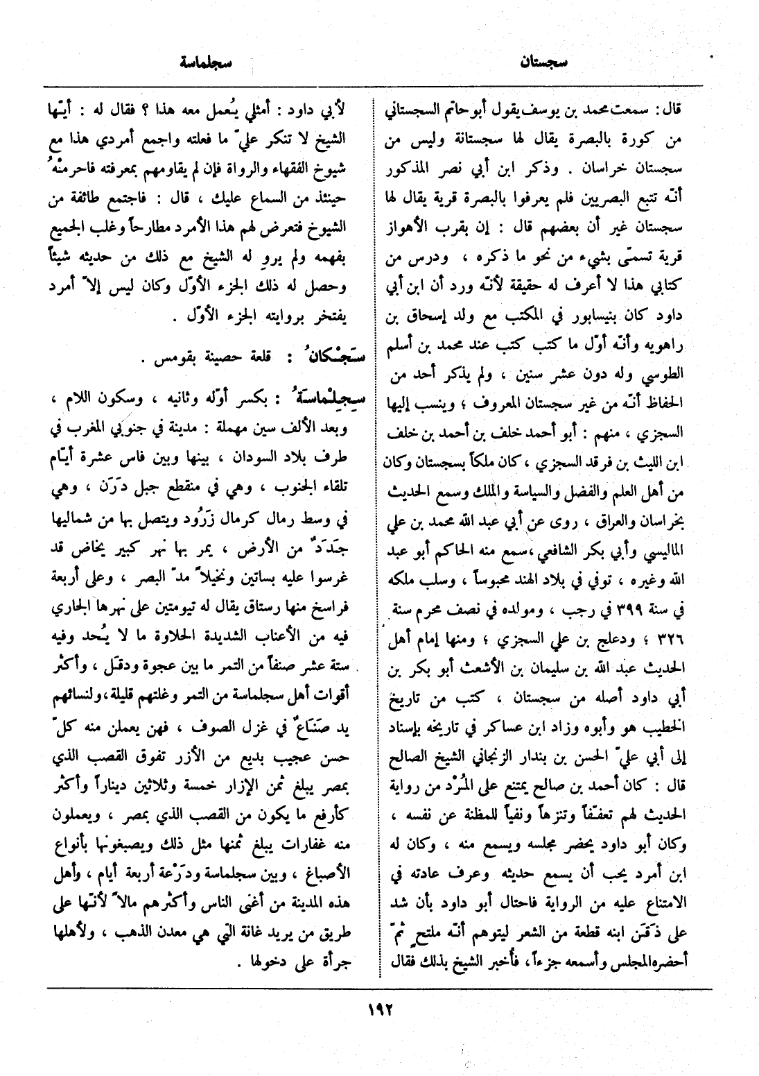 قال: سمعت محمد بن يوسف يقول أبو حاتم السجستاني من كورة بالبصرة يقال لها سجستانة وليس من سجستان خراسان. وذكر ابن أبي نصر المذكور أنّه تتبع البصريين فلم يعرفوا بالبصرة قرية يقال لها سجستان غير أن بعضهم قال: إن بقرب الأهواز قرية تسمّى بشيء من نحو ما ذكره، ودرس من كتابي هذا لا أعرف له حقيقة لأنّه ورد أن ابن أبي داود كان بنيسابور في المكتب مع ولد إسحاق بن راهويه وأنّه أوّل ما كتب كتب عند محمد بن أسلم الطوسي وله دون عشر سنين، ولم يذكر أحد من الحفاظ أنّه من غير سجستان المعروف، وينسب إليها السجزي، منهم: أبو أحمد خلف بن أحمد بن خلف ابن الليث بن فرقد السجزي، كان ملكا بسجستان وكان من أهل العلم والفضل والسياسة والملك وسمع الحديث بخراسان والعراق، روى عن أبي عبد الله محمد بن علي الماليسي وأبي بكر الشافعي، سمع منه الحاكم أبو عبد الله وغيره، توفي في بلاد الهند محبوسا، وسلب ملكه في سنة 399 في رجب، ومولده في نصف محرم سنة 326، ودعلج بن علي السجزي، ومنها إمام أهل الحديث عبد الله بن سليمان بن الأشعث أبو بكر بن أبي داود أصله من سجستان، كتب من تاريخ الخطيب هو وأبوه وزاد ابن عساكر في تاريخه بإسناد إلى أبي عليّ الحسن بن بندار الزنجاني الشيخ الصالح قال: كان أحمد بن صالح يمتنع على المرد من رواية الحديث لهم تعفّفا وتنزها ونفيا للمظنة عن نفسه، وكان أبو داود يحضر مجلسه ويسمع منه، وكان له ابن أمرد يحب أن يسمع حديثه وعرف عادته في الامتناع عليه من الرواية فاحتال أبو داود بأن شد على ذقن ابنه قطعة من الشعر ليتوهم أنّه ملتح ثمّ أحضره المجلس وأسمعه جزءا، فأخبر الشيخ بذلك فقال لأبي داود: أمثلي يعمل معه هذا؟ فقال له: أيّها الشيخ لا تنكر عليّ ما فعلته واجمع أمردي هذا مع شيوخ الفقهاء والرواة فإن لم يقاومهم بمعرفته فاحرمه حينئذ من السماع عليك، قال: فاجتمع طائفة من الشيوخ فتعرض لهم هذا الأمرد مطارحا وغلب الجميع بفهمه ولم يرو له الشيخ مع ذلك من حديثه شيئا وحصل له ذلك الجزء الأوّل وكان ليس إلّا أمرد يفتخر بروايته الجزء الأوّل.