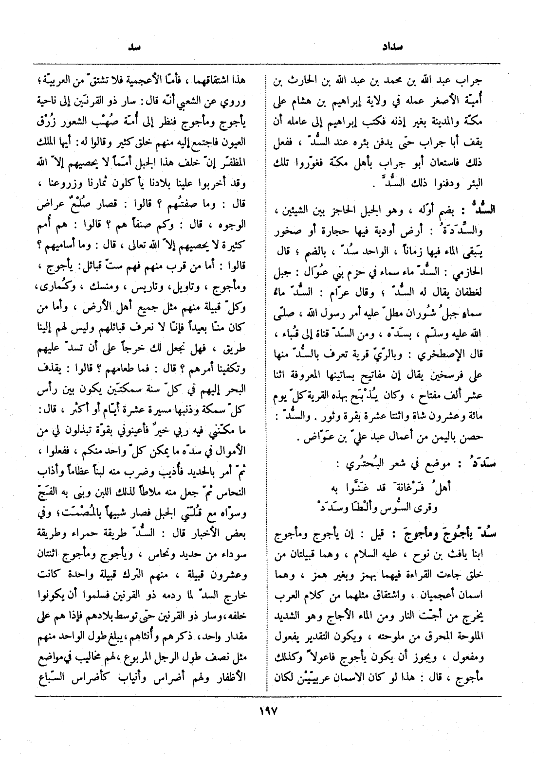 بضم أوّله، وهو الجبل الحاجز بين الشيئين، والسّددة: أرض أودية فيها حجارة أو صخور يبقى الماء فيها زمانا، الواحد سدّ، بالضم، قال الحازمي: السّدّ ماء سماء في حزم بني عوال: جبل لغطفان يقال له السّدّ، وقال عرّام: السّدّ ماء سماء جبل شوران مطلّ عليه أمر رسول الله، صلّى الله عليه وسلّم، بسدّه، ومن السّدّ قناة إلى قباء، قال الإصطخري: وبالرّيّ قرية تعرف بالسّدّ منها على فرسخين يقال إن مفاتيح بساتينها المعروفة اثنا عشر ألف مفتاح، وكان يذبح بهذه القرية كلّ يوم مائة وعشرون شاة واثنتا عشرة بقرة وثور. والسّدّ: