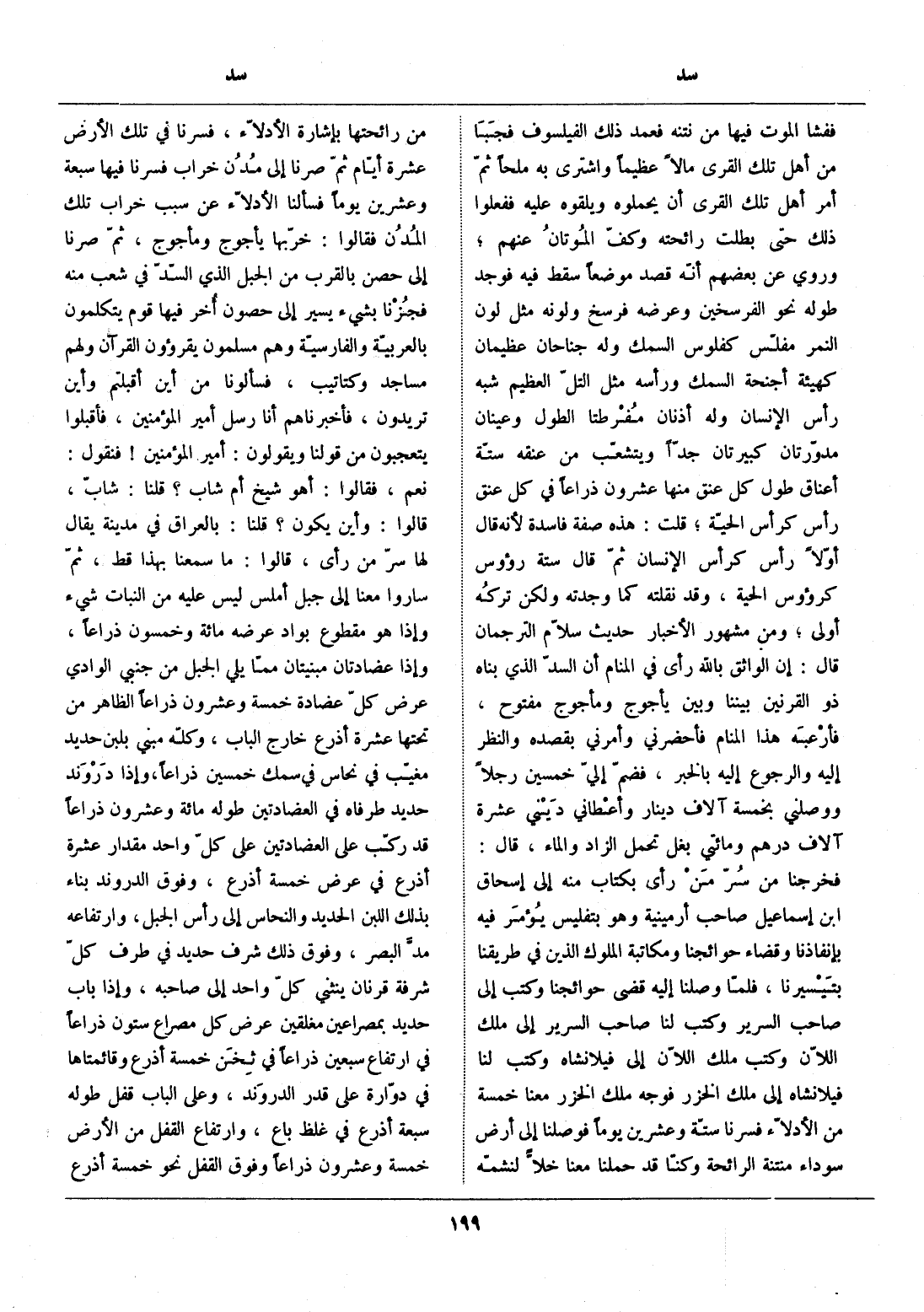 نعم، فقالوا: أهو شيخ أم شاب؟ قلنا: شابّ، قالوا: وأين يكون؟ قلنا: بالعراق في مدينة يقال لها سرّ من رأى، قالوا: ما سمعنا بهذا قط، ثمّ ساروا معنا إلى جبل أملس ليس عليه من النبات شيء وإذا هو مقطوع بواد عرضه مائة وخمسون ذراعا، وإذا عضادتان مبنيتان ممّا يلي الجبل من جنبي الوادي عرض كلّ عضادة خمسة وعشرون ذراعا الظاهر من تحتها عشرة أذرع خارج الباب، وكلّه مبني بلبن حديد مغيّب في نحاس في سمك خمسين ذراعا، وإذا دروند حديد طرفاه في العضادتين طوله مائة وعشرون ذراعا قد ركّب على العضادتين على كلّ واحد مقدار عشرة أذرع في عرض خمسة أذرع، وفوق الدروند بناء بذلك اللبن الحديد والنحاس إلى رأس الجبل، وارتفاعه مدّ البصر، وفوق ذلك شرف حديد في طرف كلّ شرفة قرنان ينثني كلّ واحد إلى صاحبه، وإذا باب حديد بمصراعين مغلقين عرض كل مصراع ستون ذراعا في ارتفاع سبعين ذراعا في ثخن خمسة أذرع وقائمتاها في دوّارة على قدر الدروند، وعلى الباب قفل طوله سبعة أذرع في غلظ باع، وارتفاع القفل من الأرض خمسة وعشرون ذراعا وفوق القفل نحو خمسة أذرع