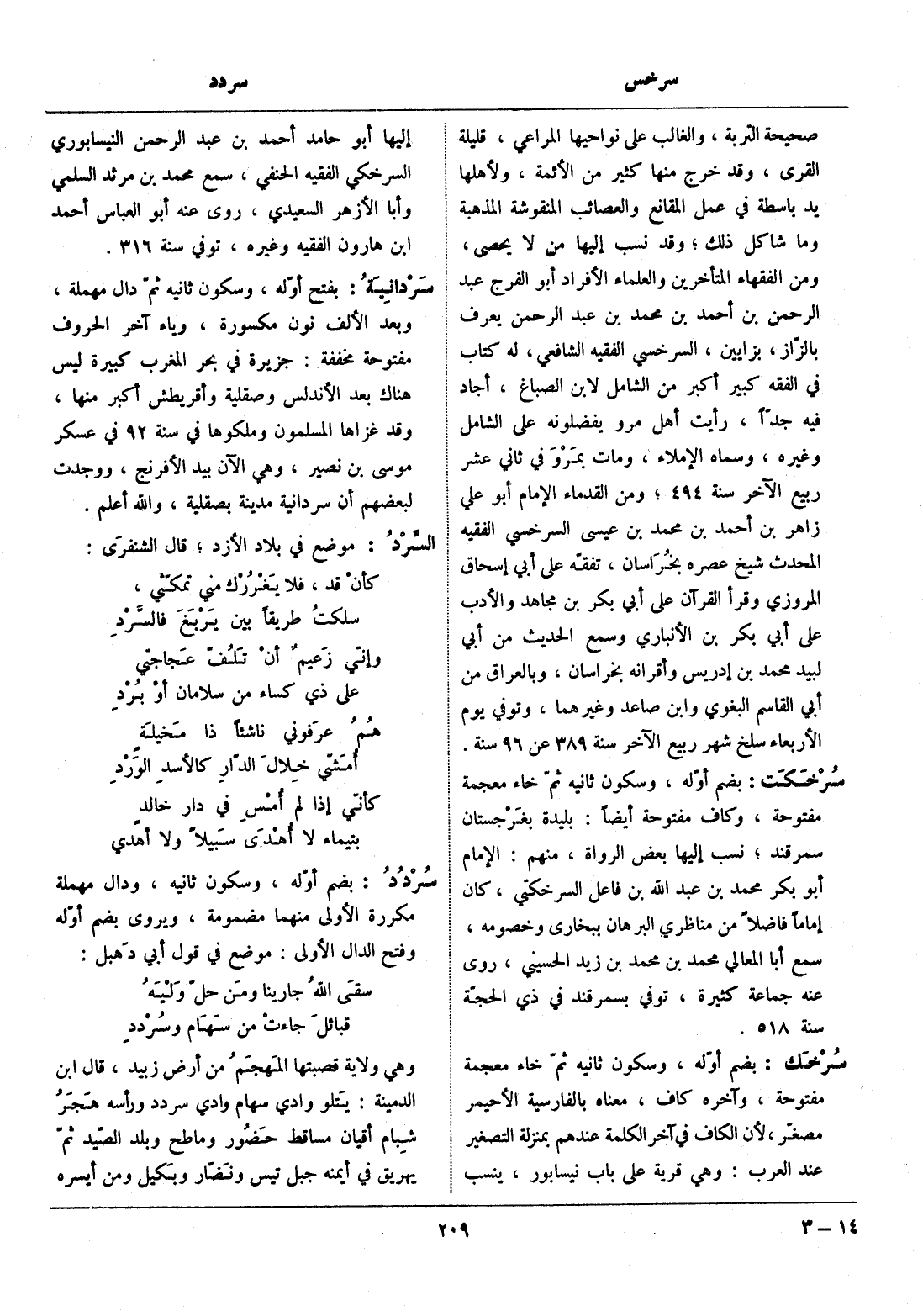 صحيحة التربة، والغالب على نواحيها المراعي، قليلة القرى، وقد خرج منها كثير من الأئمة، ولأهلها يد باسطة في عمل المقانع والعصائب المنقوشة المذهبة وما شاكل ذلك، وقد نسب إليها من لا يحصى، ومن الفقهاء المتأخرين والعلماء الأفراد أبو الفرج عبد الرحمن بن أحمد بن محمد بن عبد الرحمن يعرف بالزّاز، بزايين، السرخسي الفقيه الشافعي، له كتاب في الفقه كبير أكبر من الشامل لابن الصباغ، أجاد فيه جدّا، رأيت أهل مرو يفضلونه على الشامل وغيره، وسماه الإملاء، ومات بمرو في ثاني عشر ربيع الآخر سنة 494، ومن القدماء الإمام أبو علي زاهر بن أحمد بن محمد بن عيسى السرخسي الفقيه المحدث شيخ عصره بخراسان، تفقّه على أبي إسحاق المروزي وقرأ القرآن على أبي بكر بن مجاهد والأدب على أبي بكر بن الأنباري وسمع الحديث من أبي لبيد محمد بن إدريس وأقرانه بخراسان، وبالعراق من أبي القاسم البغوي وابن صاعد وغيرهما، وتوفي يوم الأربعاء سلخ شهر ربيع الآخر سنة 389 عن 96 سنة.