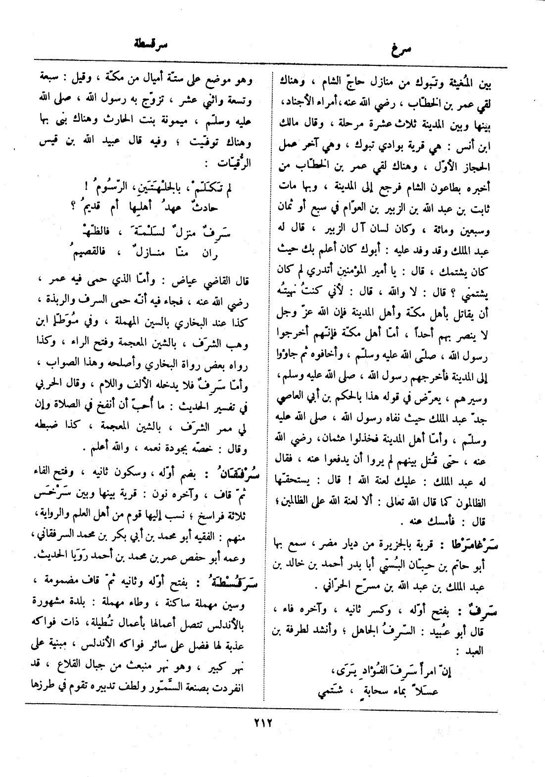 قال القاضي عياض: وأمّا الذي حمى فيه عمر، رضي الله عنه، فجاء فيه أنّه حمى السرف والربذة، كذا عند البخاري بالسين المهملة، وفي موطّإ ابن وهب الشرف، بالشين المعجمة وفتح الراء، وكذا رواه بعض رواة البخاري وأصلحه وهذا الصواب، وأمّا سرف فلا يدخله الألف واللام، وقال الحربي في تفسير الحديث: ما أحبّ أن أنفخ في الصلاة وإن لي ممر الشرف، بالشين المعجمة، كذا ضبطه وقال: خصّه بجودة نعمه، والله أعلم.
