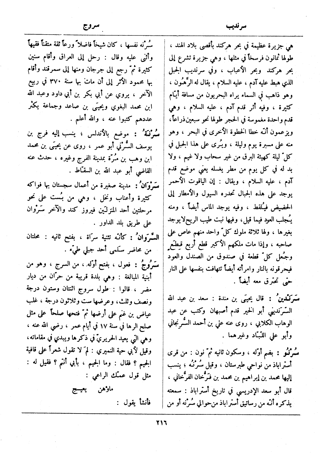 هي جزيرة عظيمة في بحر هركند بأقصى بلاد الهند، طولها ثمانون فرسخا في مثلها، وهي جزيرة تشرع إلى بحر هركند وبحر الأعباب، وفي سرنديب الجبل الذي هبط عليه آدم، عليه السلام، يقال له الرّهون، وهو ذاهب في السماء يراه البحريون من مسافة أيّام كثيرة، وفيه أثر قدم آدم، عليه السلام، وهي قدم واحدة مغموسة في الحجر طولها نحو سبعين ذراعا، ويزعمون أنّه خطا الخطوة الأخرى في البحر، وهو منه على مسيرة يوم وليلة، ويرى على هذا الجبل في كلّ ليلة كهيئة البرق من غير سحاب ولا غيم، ولا بد له في كل يوم من مطر يغسله يعني موضع قدم آدم، عليه السلام، ويقال: إن الياقوت الأحمر يوجد على هذه الجبال تحدره السيول والأمطار إلى الحضيض فيلقط، وفيه يوجد الماس أيضا، ومنه يجلب العود فيما قيل، وفيها نبت طيب الريح لا يوجد بغيرها، ولها ثلاثة ملوك كلّ واحد منهم عاص على صاحبه، وإذا مات ملكهم الأكبر قطع أربع قطع وجعل كلّ قطعة في صندوق من الصندل والعود فيحرقونه بالنار وامرأته أيضا تتهافت بنفسها على النار حتى تحترق معه أيضا.