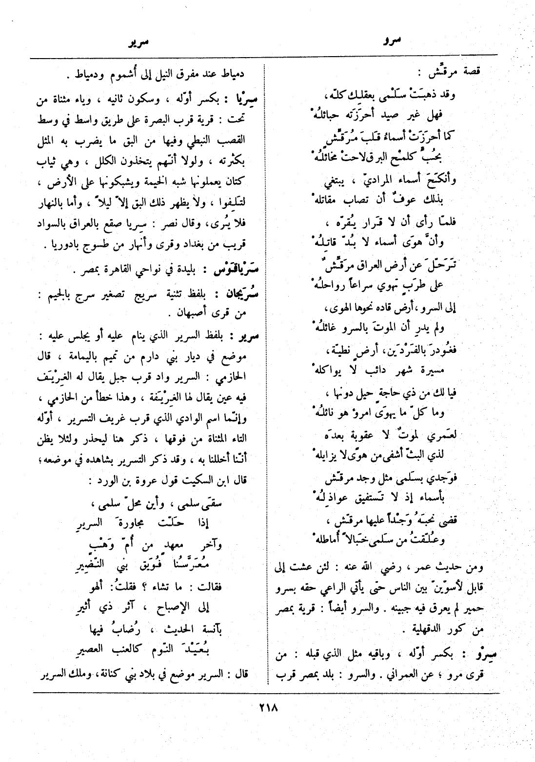 ومن حديث عمر، رضي الله عنه: لئن عشت إلى قابل لأسوّينّ بين الناس حتى يأتي الراعي حقه بسرو حمير لم يعرق فيه جبينه. والسرو أيضا: قرية بمصر من كور الدقهلية.