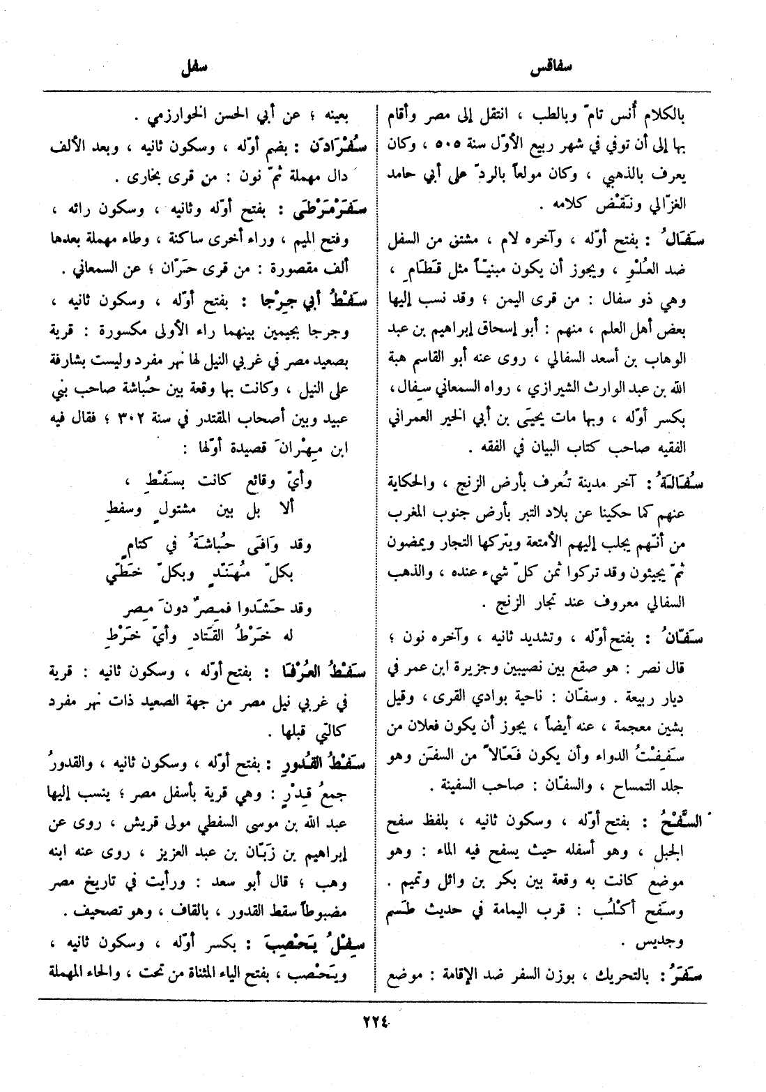 بفتح أوّله، وسكون ثانيه، والقدور جمع قدر: وهي قرية بأسفل مصر، ينسب إليها عبد الله بن موسى السفطي مولى قريش، روى عن إبراهيم بن زبّان بن عبد العزيز، روى عنه ابنه وهب، قال أبو سعد: ورأيت في تاريخ مصر مضبوطا سقط القدور، بالقاف، وهو تصحيف.