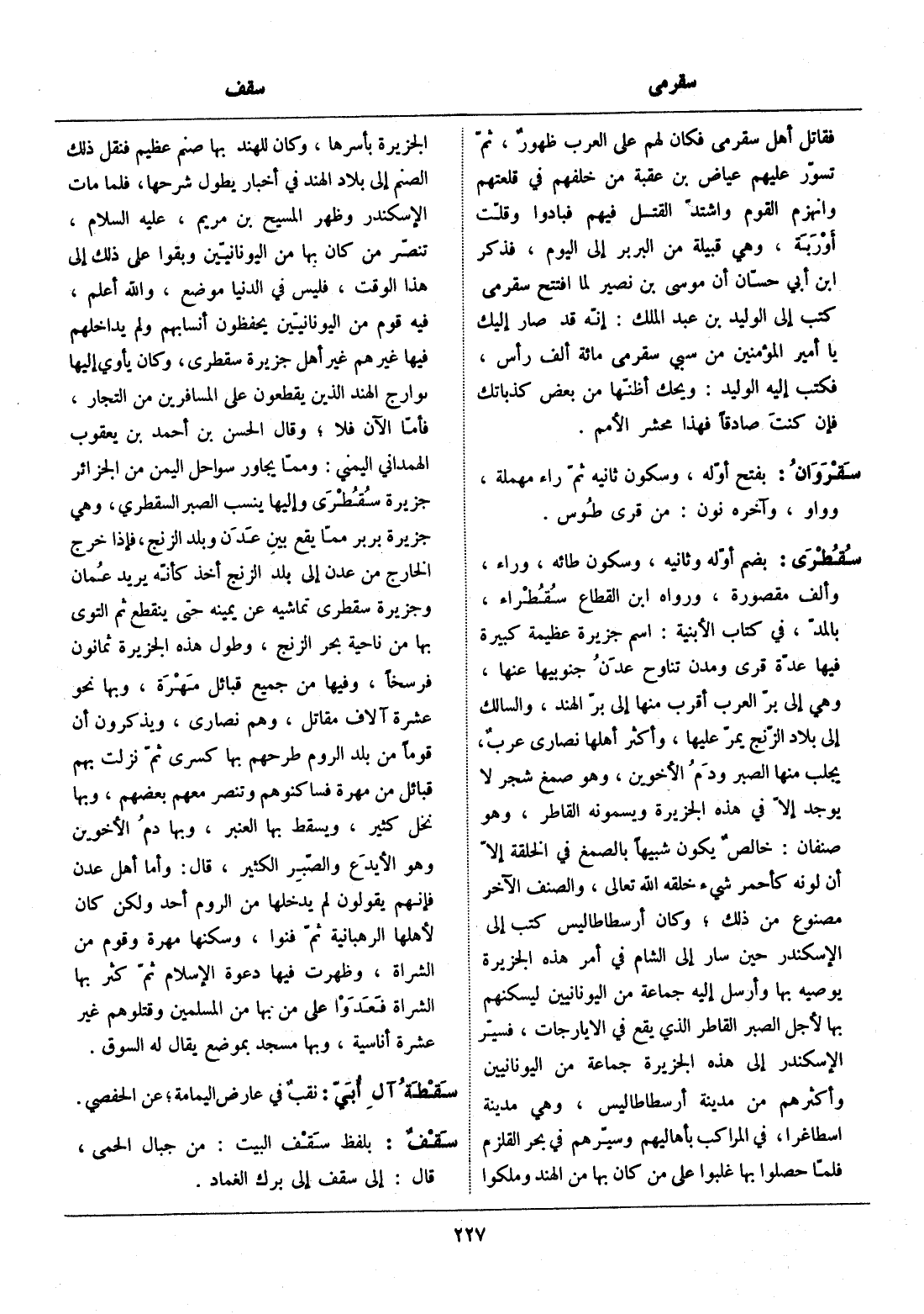 بضم أوّله وثانيه، وسكون طائه، وراء، وألف مقصورة، ورواه ابن القطاع سقطراء، بالمدّ، في كتاب الأبنية: اسم جزيرة عظيمة كبيرة فيها عدّة قرى ومدن تناوح عدن جنوبيها عنها، وهي إلى برّ العرب أقرب منها إلى برّ الهند، والسالك إلى بلاد الزّنج يمرّ عليها، وأكثر أهلها نصارى عرب، يجلب منها الصبر ودم الأخوين، وهو صمغ شجر لا يوجد إلّا في هذه الجزيرة ويسمونه القاطر، وهو صنفان: خالص يكون شبيها بالصمغ في الخلقة إلّا أن لونه كأحمر شيء خلقه الله تعالى، والصنف الآخر مصنوع من ذلك، وكان أرسطاطاليس كتب إلى الإسكندر حين سار إلى الشام في أمر هذه الجزيرة يوصيه بها وأرسل إليه جماعة من اليونانيين ليسكنهم بها لأجل الصبر القاطر الذي يقع في الايارجات، فسيّر الإسكندر إلى هذه الجزيرة جماعة من اليونانيين وأكثرهم من مدينة أرسطاطاليس، وهي مدينة اسطاغرا، في المراكب بأهاليهم وسيّرهم في بحر القلزم فلمّا حصلوا بها غلبوا على من كان بها من الهند وملكوا الجزيرة بأسرها، وكان للهند بها صنم عظيم فنقل ذلك الصنم إلى بلاد الهند في أخبار يطول شرحها، فلما مات الإسكندر وظهر المسيح بن مريم، عليه السلام، تنصّر من كان بها من اليونانيّين وبقوا على ذلك إلى هذا الوقت، فليس في الدنيا موضع، والله أعلم، فيه قوم من اليونانيّين يحفظون أنسابهم ولم يداخلهم فيها غيرهم غير أهل جزيرة سقطرى، وكان يأوي إليها بوارج الهند الذين يقطعون على المسافرين من التجار، فأمّا الآن فلا، وقال الحسن بن أحمد بن يعقوب الهمداني اليمني: وممّا يجاور سواحل اليمن من الجزائر جزيرة سقطرى وإليها ينسب الصبر السقطري، وهي جزيرة بربر ممّا يقع بين عدن وبلد الزنج، فإذا خرج الخارج من عدن إلى بلد الزنج أخذ كأنّه يريد عمان وجزيرة سقطرى تماشيه عن يمينه حتى ينقطع ثم التوى بها من ناحية بحر الزنج، وطول هذه الجزيرة ثمانون فرسخا، وفيها من جميع قبائل مهرة، وبها نحو عشرة آلاف مقاتل، وهم نصارى، ويذكرون أن قوما من بلد الروم طرحهم بها كسرى ثمّ نزلت بهم قبائل من مهرة فساكنوهم وتنصر معهم بعضهم، وبها نخل كثير، ويسقط بها العنبر، وبها دم الأخوين وهو الأيدع والصّبر الكثير، قال: وأما أهل عدن فإنّهم يقولون لم يدخلها من الروم أحد ولكن كان لأهلها الرهبانية ثمّ فنوا، وسكنها مهرة وقوم من الشراة، وظهرت فيها دعوة الإسلام ثمّ كثر بها الشراة فعدوا على من بها من المسلمين وقتلوهم غير عشرة أناسية، وبها مسجد بموضع يقال له السوق.
