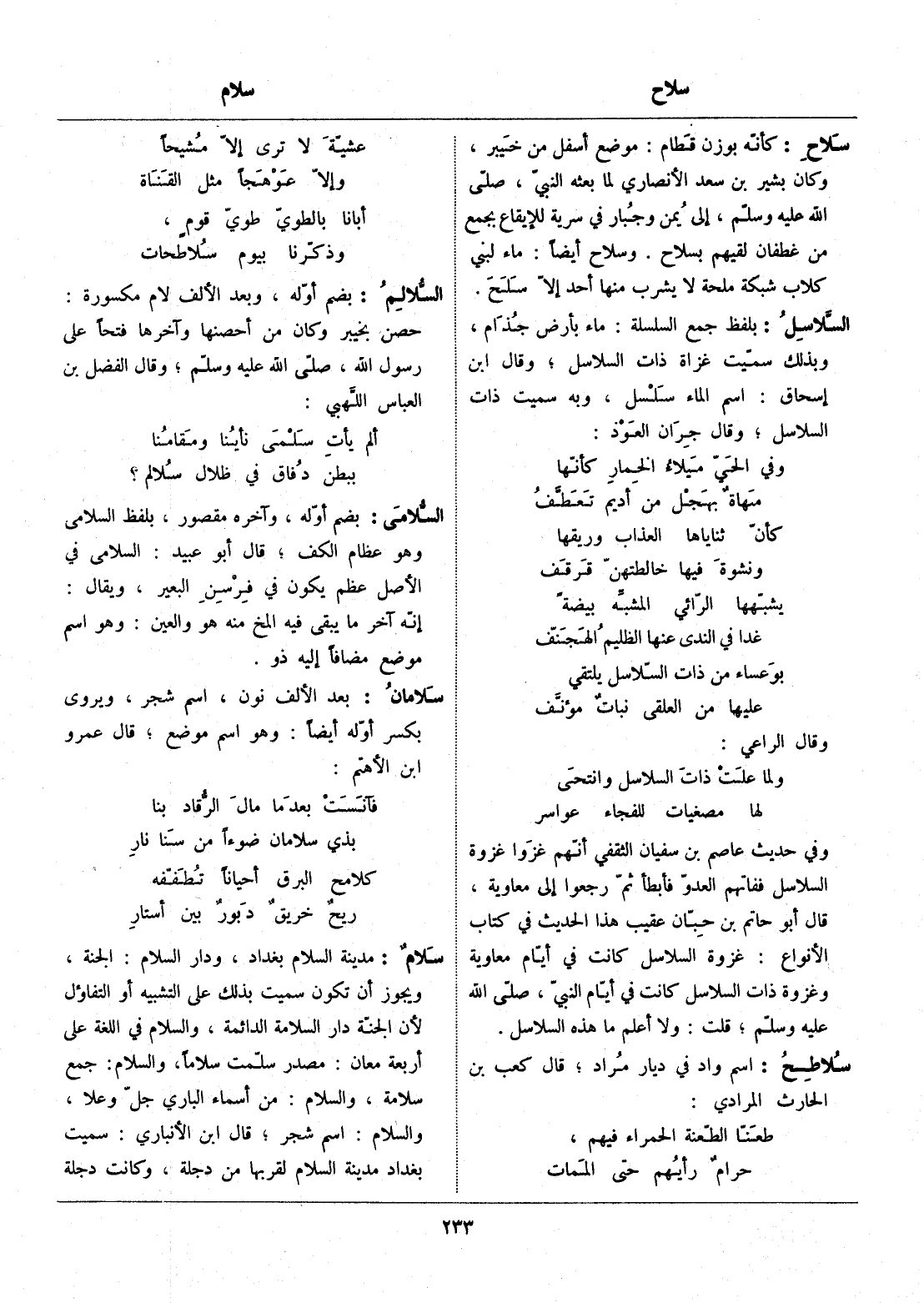 كأنّه بوزن قطام: موضع أسفل من خيبر، وكان بشير بن سعد الأنصاري لما بعثه النبيّ، صلّى الله عليه وسلّم، إلى يمن وجبار في سرية للإيقاع بجمع من غطفان لقيهم بسلاح. وسلاح أيضا: ماء لبني كلاب شبكة ملحة لا يشرب منها أحد إلّا سلح.