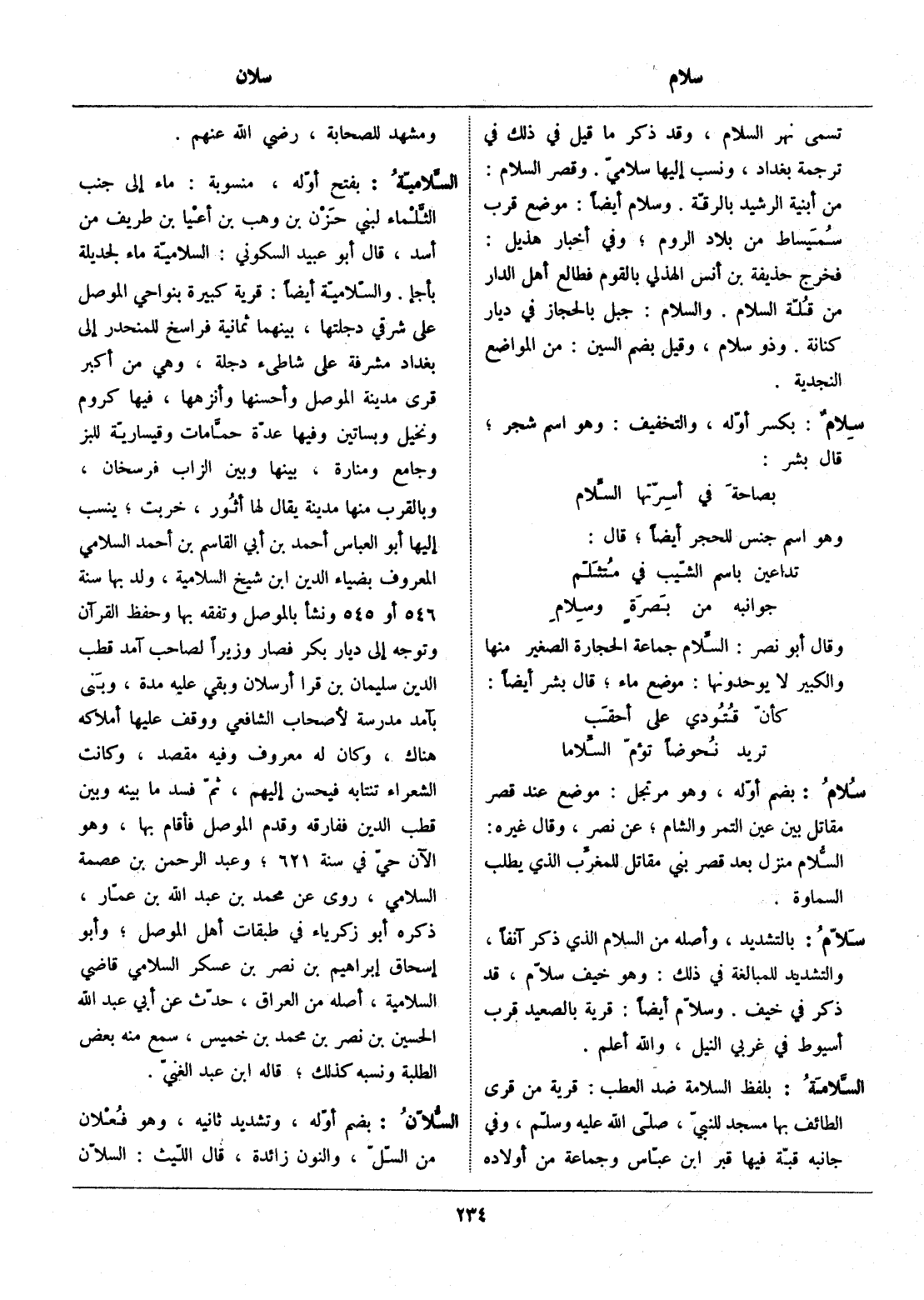 بفتح أوّله، منسوبة: ماء إلى جنب الثّلماء لبني حزن بن وهب بن أعيا بن طريف من أسد، قال أبو عبيد السكوني: السلاميّة ماء لجديلة بأجإ. والسّلاميّة أيضا: قرية كبيرة بنواحي الموصل على شرقي دجلتها، بينهما ثمانية فراسخ للمنحدر إلى بغداد مشرفة على شاطئ دجلة، وهي من أكبر قرى مدينة الموصل وأحسنها وأنزهها، فيها كروم ونخيل وبساتين وفيها عدّة حمّامات وقيساريّة للبز وجامع ومنارة، بينها وبين الزاب فرسخان، وبالقرب منها مدينة يقال لها أثور، خربت، ينسب إليها أبو العباس أحمد بن أبي القاسم بن أحمد السلامي المعروف بضياء الدين ابن شيخ السلامية، ولد بها سنة 546 أو 545 ونشأ بالموصل وتفقه بها وحفظ القرآن وتوجه إلى ديار بكر فصار وزيرا لصاحب آمد قطب الدين سليمان بن قرا أرسلان وبقي عليه مدة، وبنى بآمد مدرسة لأصحاب الشافعي ووقف عليها أملاكه هناك، وكان له معروف وفيه مقصد، وكانت الشعراء تنتابه فيحسن إليهم، ثمّ فسد ما بينه وبين قطب الدين ففارقه وقدم الموصل فأقام بها، وهو الآن حيّ في سنة 621، وعبد الرحمن بن عصمة السلامي، روى عن محمد بن عبد الله بن عمّار، ذكره أبو زكرياء في طبقات أهل الموصل، وأبو إسحاق إبراهيم بن نصر بن عسكر السلامي قاضي السلامية، أصله من العراق، حدّث عن أبي عبد الله الحسين بن نصر بن محمد بن خميس، سمع منه بعض الطلبة ونسبه كذلك، قاله ابن عبد الغنيّ.