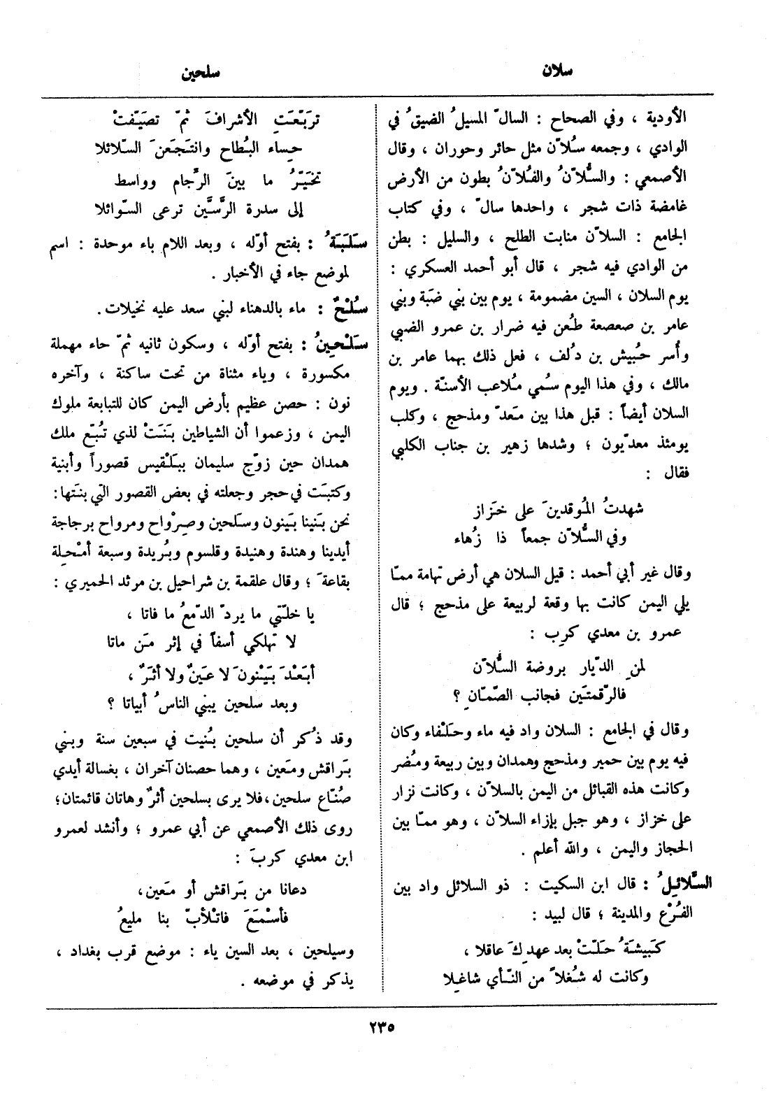 الأودية، وفي الصحاح: السالّ المسيل الضيق في الوادي، وجمعه سلّان مثل حائر وحوران، وقال الأصمعي: والسّلّان والفلّان بطون من الأرض غامضة ذات شجر، واحدها سالّ، وفي كتاب الجامع: السلّان منابت الطلح، والسليل: بطن من الوادي فيه شجر، قال أبو أحمد العسكري: