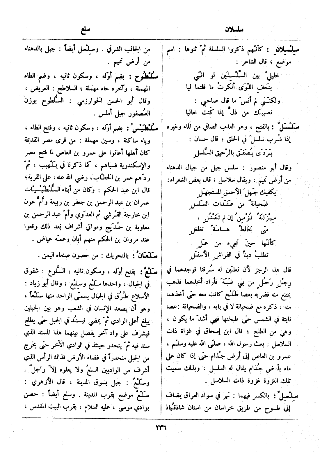 قال هذا الرجز لأن نعلين له سرقتا فوجدهما في رجل رجل من بني ضبّة فأراد أخذهما فذهب يمتنع منه فضربه بعصا طلح كانت معه حتى أخذهما منه، ذكره مع ضحيانة لا في بابه، والضحيانة: عصا نابتة في الشمس حتى طبختها فهي أشدّ ما يكون، وهي من الطلح، قال ابن إسحاق في غزاة ذات السلاسل: بعث رسول الله، صلّى الله عليه وسلّم، عمرو بن العاص إلى أرض جذام حتى إذا كان على ماء بأرض جذام يقال له السلسل، وبذلك سميت تلك الغزوة غزوة ذات السلاسل.