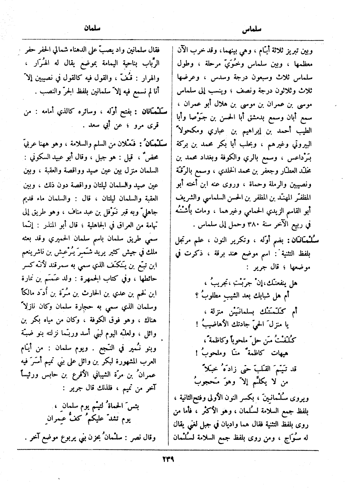 السلمان منزل بين عين صيد وواقصة والعقبة، وبين عين صيد والسلمان ليلتان وواقصة دون ذلك، وبين العقبة والسلمان ليلتان، قال: والسلمان ماء قديم جاهليّ وبه قبر نوفل بن عبد مناف، وهو طريق إلى تهامة من العراق في الجاهلية، قال أبو المنذر: إنّما سمي طريق سلمان باسم سلمان الحميري وقد بعثه ملك في جيش كثير يريد شمر يرعش بن ناشر ينعم ابن تبّع بن ينكف الذي سمي به سمرقند لأنّه كسر حائطها، وفي كتاب الجمهرة: ولد عمم بن نمارة ابن لخم بن عدي بن الحارث بن مرّة بن أدد مالكا وسلمان الذي سمي به حجارة سلمان وكان نازلا هناك، وهو فوق الكوفة، وكان من مياه بكر بن وائل، ولعلّه اليوم لبني أسد وربّما نزلته بنو ضبّة وبنو نمير في النّجع. ويوم سلمان: من أيّام العرب المشهورة لبكر بن وائل على بني تميم أسر فيه عمران بن مرّة الشيباني الأقرع بن حابس ورئيسا آخر من تميم، فلذلك قال جرير: