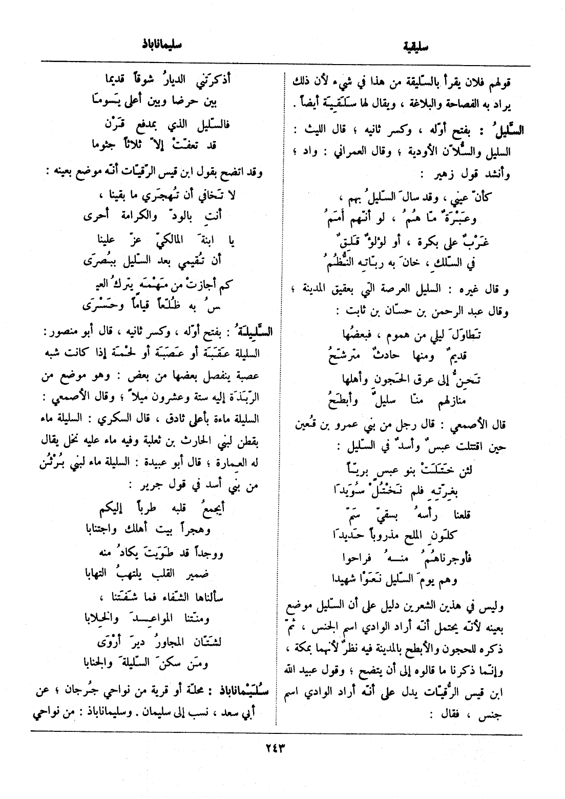 وليس في هذين الشعرين دليل على أن السّليل موضع بعينه لأنّه يحتمل أنّه أراد الوادي اسم الجنس، ثمّ ذكره للحجون والأبطح بالمدينة فيه نظر لأنهما بمكة، وإنّما ذكرنا ما قالوه إلى أن يتضح، وقول عبيد الله ابن قيس الرّقيّات يدل على أنّه أراد الوادي اسم جنس، فقال: