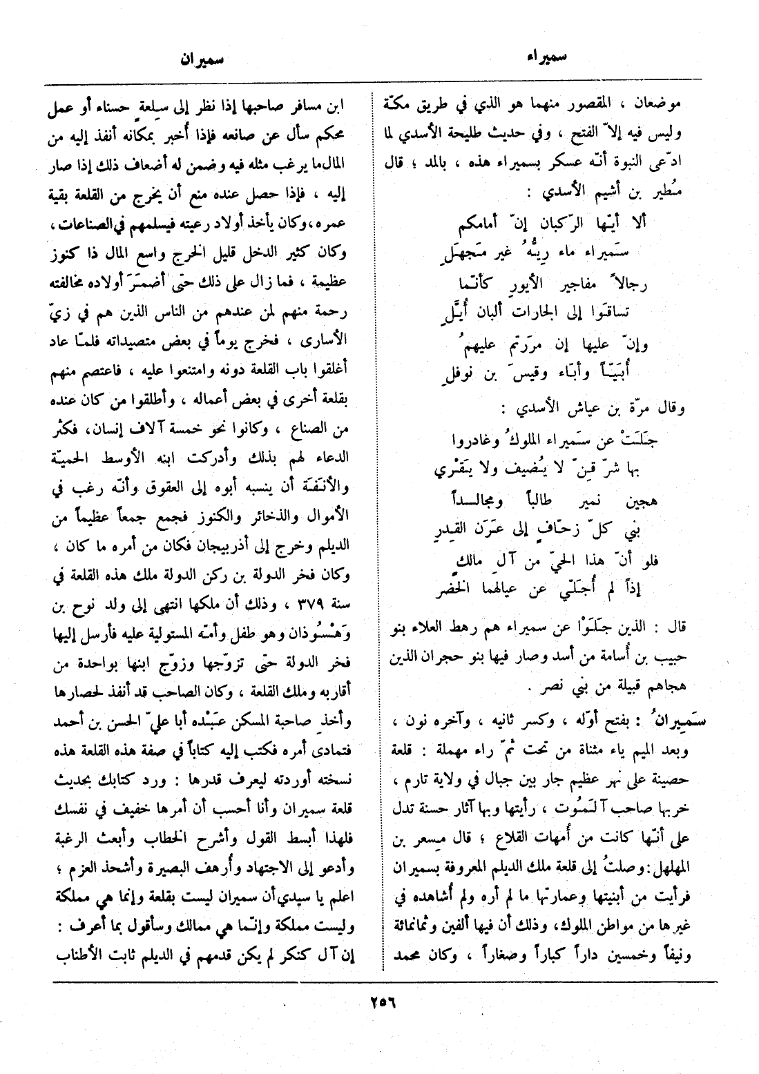 بفتح أوّله، وكسر ثانيه، وآخره نون، وبعد الميم ياء مثناة من تحت ثمّ راء مهملة: قلعة حصينة على نهر عظيم جار بين جبال في ولاية تارم، خربها صاحب الموت، رأيتها وبها آثار حسنة تدل على أنّها كانت من أمهات القلاع، قال مسعر بن المهلهل: وصلت إلى قلعة ملك الديلم المعروفة بسميران فرأيت من أبنيتها وعمارتها ما لم أره ولم أشاهده في غيرها من مواطن الملوك، وذلك أن فيها ألفين وثمانمائة ونيفا وخمسين دارا كبارا وصغارا، وكان محمد ابن مسافر صاحبها إذا نظر إلى سلعة حسناء أو عمل محكم سأل عن صانعه فإذا أخبر بمكانه أنفذ إليه من المال ما يرغب مثله فيه وضمن له أضعاف ذلك إذا صار إليه، فإذا حصل عنده منع أن يخرج من القلعة بقية عمره، وكان يأخذ أولاد رعيته فيسلمهم في الصناعات، وكان كثير الدخل قليل الخرج واسع المال ذا كنوز عظيمة، فما زال على ذلك حتى أضمر أولاده مخالفته رحمة منهم لمن عندهم من الناس الذين هم في زيّ الأسارى، فخرج يوما في بعض متصيداته فلمّا عاد أغلقوا باب القلعة دونه وامتنعوا عليه، فاعتصم منهم بقلعة أخرى في بعض أعماله، وأطلقوا من كان عنده من الصناع، وكانوا نحو خمسة آلاف إنسان، فكثر الدعاء لهم بذلك وأدركت ابنه الأوسط الحميّة والأنفة أن ينسبه أبوه إلى العقوق وأنّه رغب في الأموال والذخائر والكنوز فجمع جمعا عظيما من الديلم وخرج إلى أذربيجان فكان من أمره ما كان، وكان فخر الدولة بن ركن الدولة ملك هذه القلعة في سنة 379، وذلك أن ملكها انتهى إلى ولد نوح بن وهسوذان وهو طفل وأمّه المستولية عليه فأرسل إليها فخر الدولة حتى تزوّجها وزوّج ابنها بواحدة من أقاربه وملك القلعة، وكان الصاحب قد أنفذ لحصارها وأخذ صاحبة المسكن عبده أبا عليّ الحسن بن أحمد فتمادى أمره فكتب إليه كتابا في صفة هذه القلعة هذه نسخته أوردته ليعرف قدرها: ورد كتابك بحديث قلعة سميران وأنا أحسب أن أمرها خفيف في نفسك فلهذا أبسط القول وأشرح الخطاب وأبعث الرغبة وأدعو إلى الاجتهاد وأرهف البصيرة وأشحذ العزم، اعلم يا سيدي أن سميران ليست بقلعة وإنما هي مملكة وليست مملكة وإنّما هي ممالك وسأقول بما أعرف: