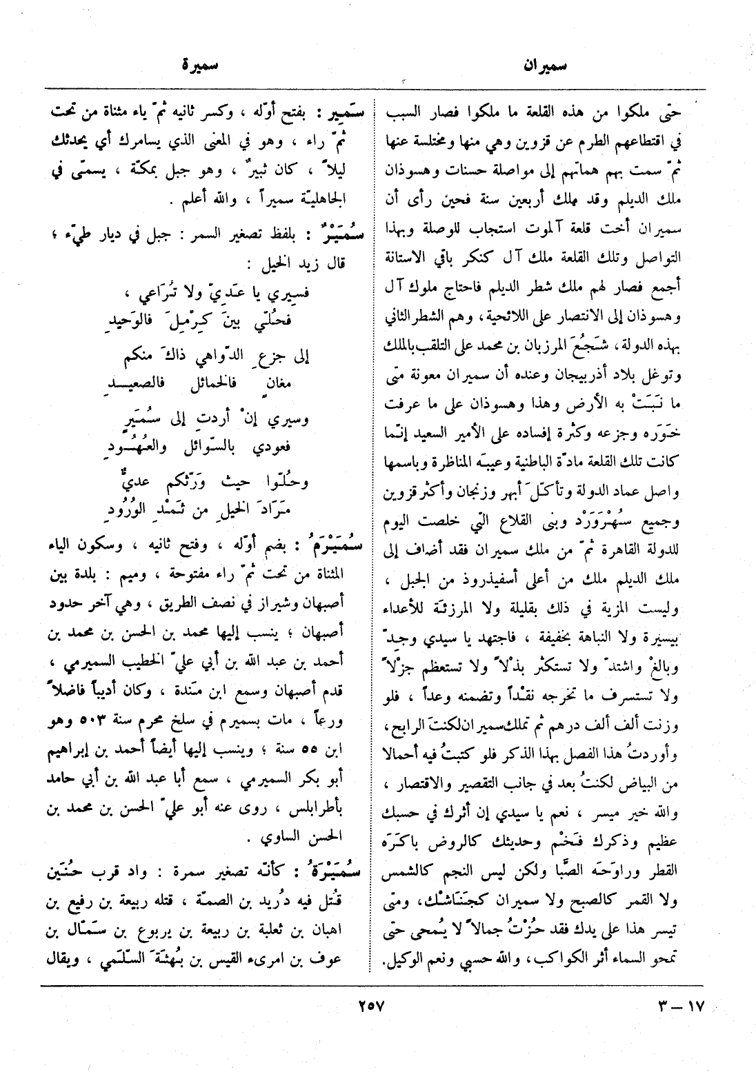 حتى ملكوا من هذه القلعة ما ملكوا فصار السبب في اقتطاعهم الطرم عن قزوين وهي منها ومختلسة عنها ثمّ سمت بهم هماتهم إلى مواصلة حسنات وهسوذان ملك الديلم وقد ملك أربعين سنة فحين رأى أن سميران أخت قلعة الموت استجاب للوصلة وبهذا التواصل وتلك القلعة ملك آل كنكر باقي الاستانة أجمع فصار لهم ملك شطر الديلم فاحتاج ملوك آل وهسوذان إلى الانتصار على اللائحية، وهم الشطر الثاني بهذه الدولة، شجع المرزبان بن محمد على التلقب بالملك وتوغل بلاد أذربيجان وعنده أن سميران معونة متى ما نبت به الأرض وهذا وهسوذان على ما عرفت خوره وجزعه وكثرة إفساده على الأمير السعيد إنّما كانت تلك القلعة مادّة الباطنية وعيبه المناظرة وباسمها واصل عماد الدولة وتأكّل أبهر وزنجان وأكثر قزوين وجميع سهرورد وبنى القلاع التي خلصت اليوم للدولة القاهرة ثمّ من ملك سميران فقد أضاف إلى ملك الديلم ملك من أعلى أسفيذروذ من الجبل، وليست المزية في ذلك بقليلة ولا المرزئة للأعداء بيسيرة ولا النباهة بخفيفة، فاجتهد يا سيدي وجدّ وبالغ واشتدّ ولا تستكثر بذلا ولا تستعظم جزلا ولا تستسرف ما تخرجه نقدا وتضمنه وعدا، فلو وزنت ألف ألف درهم ثم تملك سميران لكنت الرابح، وأوردت هذا الفصل بهذا الذكر فلو كتبت فيه أحمالا من البياض لكنت بعد في جانب التقصير والاقتصار، والله خير ميسر، نعم يا سيدي إن أثرك في حسبك عظيم وذكرك فخم وحديثك كالروض باكره القطر وراوحه الصّبا ولكن ليس النجم كالشمس ولا القمر كالصبح ولا سميران كجناشك، ومتى تيسر هذا على يدك فقد حزت جمالا لا يمحى حتى تمحو السماء أثر الكواكب، والله حسبي ونعم الوكيل.