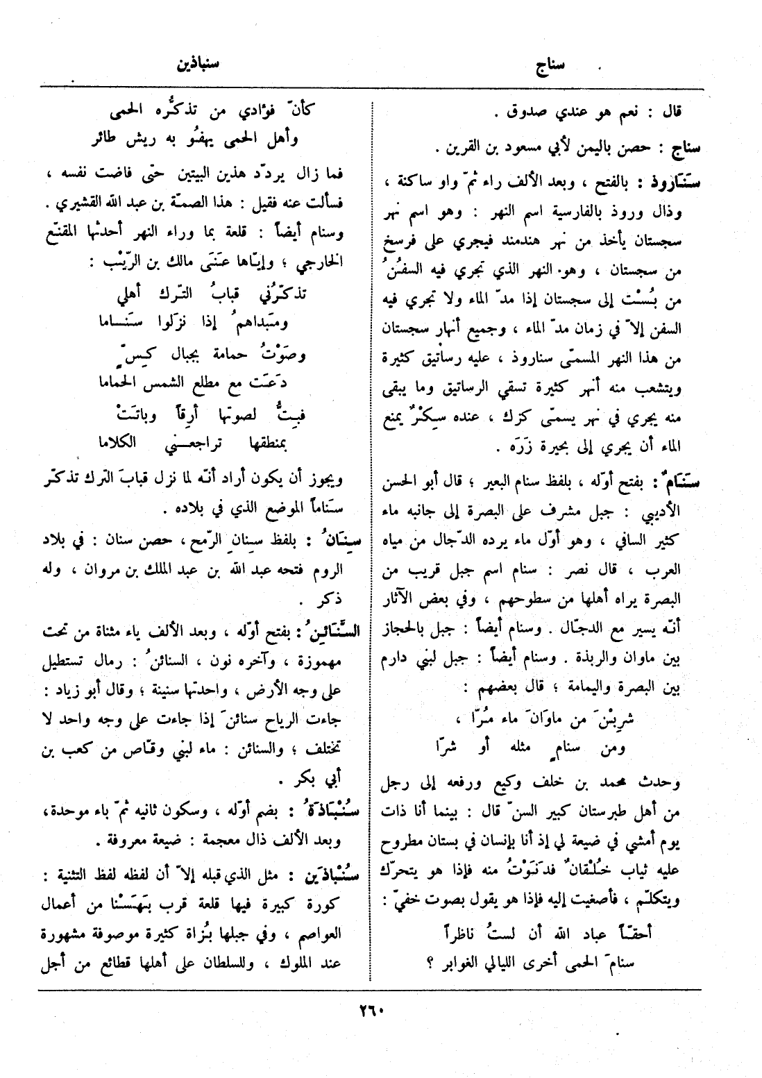 بفتح أوّله، بلفظ سنام البعير، قال أبو الحسن الأديبي: جبل مشرف على البصرة إلى جانبه ماء كثير السافي، وهو أوّل ماء يرده الدّجال من مياه العرب، قال نصر: سنام اسم جبل قريب من البصرة يراه أهلها من سطوحهم، وفي بعض الآثار أنّه يسير مع الدجّال. وسنام أيضا: جبل بالحجاز بين ماوان والربذة. وسنام أيضا: جبل لبني دارم بين البصرة واليمامة، قال بعضهم: