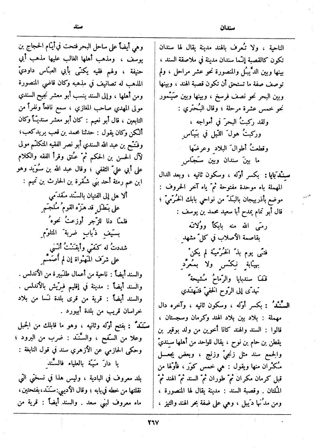 بكسر أوّله، وسكون ثانيه، وآخره دال مهملة: بلاد بين بلاد الهند وكرمان وسجستان، قالوا: السند والهند كانا أخوين من ولد بوقير بن يقطن بن حام بن نوح، يقال للواحد من أهلها سنديّ والجمع سند مثل زنجيّ وزنج، وبعض يجعل مكران منها ويقول: هي خمس كور، فأوّلها من قبل كرمان مكران ثمّ طوران ثمّ السند ثمّ الهند ثمّ الملتان. وقصبة السند: مدينة يقال لها المنصورة، ومن مدنها ديبل، وهي على ضفة بحر الهند والتيز، وهي أيضا على ساحل البحر فتحت في أيّام الحجاج بن يوسف، ومذهب أهلها الغالب عليها مذهب أبي حنيفة، ولهم فقيه يكنّى بأبي العبّاس داوديّ المذهب له تصانيف في مذهبه وكان قاضي المنصورة ومن أهلها، وإلى السند ينسب أبو معشر نجيح السندي مولى المهدي صاحب المغازي، سمع نافعا ونفرا من التابعين، قال أبو نعيم: كان أبو معشر سنديّا وكان ألكن وكان يقول: حدثنا محمد بن قعب يريد كعب، وفتح بن عبد الله السندي أبو نصر الفقيه المتكلّم مولى لآل الحسن بن الحكم ثمّ عتق وقرأ الفقه والكلام على أبي عليّ الثقفي، وقال عبد الله بن سويد وهو ابن عم رمتة أحد بني شقرة بن الحارث بن تميم: