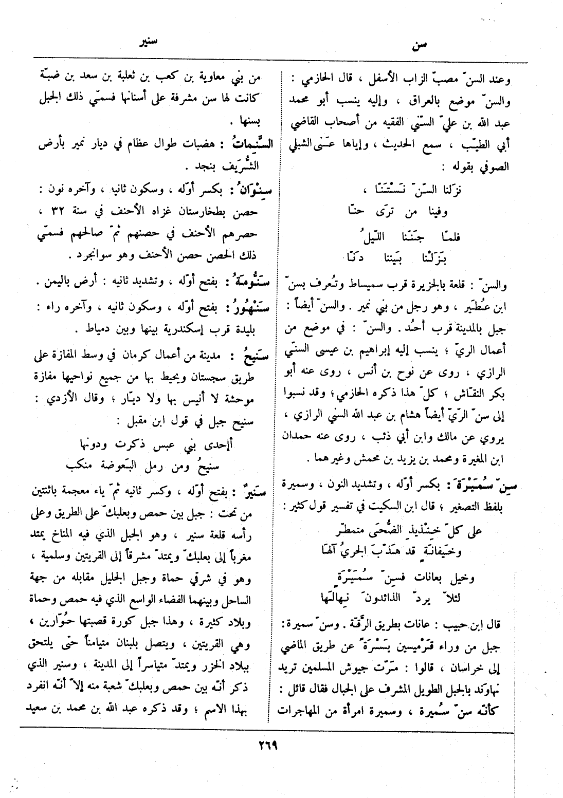 بفتح أوّله، وكسر ثانيه ثمّ ياء معجمة باثنتين من تحت: جبل بين حمص وبعلبكّ على الطريق وعلى رأسه قلعة سنير، وهو الجبل الذي فيه المناخ يمتد مغربا إلى بعلبكّ ويمتدّ مشرقا إلى القريتين وسلمية، وهو في شرقي حماة وجبل الجليل مقابله من جهة الساحل وبينهما الفضاء الواسع الذي فيه حمص وحماة وبلاد كثيرة، وهذا جبل كورة قصبتها حوّارين، وهي القريتين، ويتصل بلبنان متيامنا حتى يلتحق ببلاد الخزر ويمتدّ متياسرا إلى المدينة، وسنير الذي ذكر أنّه بين حمص وبعلبكّ شعبة منه إلّا أنّه انفرد بهذا الاسم، وقد ذكره عبد الله بن محمد بن سعيد