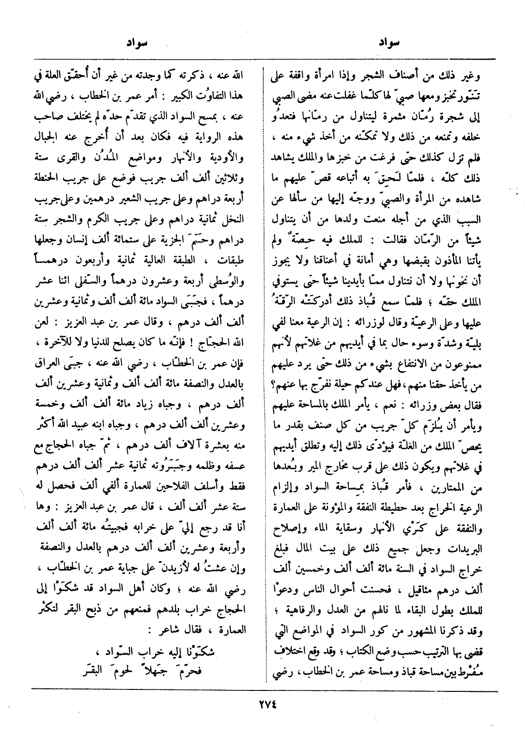 فقال بعض وزرائه: نعم، يأمر الملك بالمساحة عليهم ويأمر أن يلزم كلّ جريب من كل صنف بقدر ما يحصّ الملك من الغلّة فيؤدّى ذلك إليه وتطلق أيديهم في غلاتهم ويكون ذلك على قرب مخارج المير وبعدها من الممتارين، فأمر قباذ بمساحة السواد وإلزام الرعية الخراج بعد حطيطة النفقة والمؤونة على العمارة والنفقة على كري الأنهار وسقاية الماء وإصلاح البريدات وجعل جميع ذلك على بيت المال فبلغ خراج السواد في السنة مائة ألف ألف وخمسين ألف ألف درهم مثاقيل، فحسنت أحوال الناس ودعوا للملك بطول البقاء لما نالهم من العدل والرفاهية، وقد ذكرنا المشهور من كور السواد في المواضع التي قضى بها الترتيب حسب وضع الكتاب، وقد وقع اختلاف مفرط بين مساحة قباذ ومساحة عمر بن الخطاب، رضي الله عنه، ذكرته كما وجدته من غير أن أحقّق العلة في هذا التفاوت الكبير: أمر عمر بن الخطاب، رضي الله عنه، بمسح السواد الذي تقدّم حدّه لم يختلف صاحب هذه الرواية فيه فكان بعد أن أخرج عنه الجبال والأودية والأنهار ومواضع المدن والقرى ستة وثلاثين ألف ألف جريب فوضع على جريب الحنطة أربعة دراهم وعلى جريب الشعير درهمين وعلى جريب النخل ثمانية دراهم وعلى جريب الكرم والشجر ستة دراهم وحتم الجزية على ستمائة ألف إنسان وجعلها طبقات، الطبقة العالية ثمانية وأربعون درهما والوسطى أربعة وعشرون درهما والسّفلى اثنا عشر درهما، فجبى السواد مائة ألف ألف وثمانية وعشرين ألف ألف درهم، وقال عمر بن عبد العزيز: لعن الله الحجّاج! فإنّه ما كان يصلح للدنيا ولا للآخرة، فإن عمر بن الخطّاب، رضي الله عنه، جبى العراق بالعدل والنصفة مائة ألف ألف وثمانية وعشرين ألف ألف درهم، وجباه زياد مائة ألف ألف وخمسة وعشرين ألف ألف درهم، وجباه ابنه عبيد الله أكثر منه بعشرة آلاف ألف درهم، ثمّ جباه الحجاج مع عسفه وظلمه وجبروته ثمانية عشر ألف ألف درهم فقط وأسلف الفلاحين للعمارة ألفي ألف فحصل له ستة عشر ألف ألف، قال عمر بن عبد العزيز: وها أنا قد رجع إليّ على خرابه فجبيته مائة ألف ألف وأربعة وعشرين ألف ألف درهم بالعدل والنصفة وإن عشت له لأزيدنّ على جباية عمر بن الخطّاب، رضي الله عنه، وكان أهل السواد قد شكوا إلى الحجاج خراب بلدهم فمنعهم من ذبح البقر لتكثر العمارة، فقال شاعر: