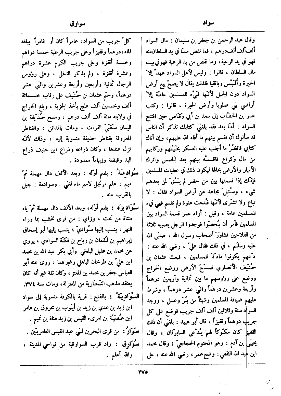 وقال عبد الرحمن بن جعفر بن سليمان: مال السواد ألف ألف ألف درهم، فما نقص ممّا في يد السلطان منه فهو في يد الرعية، وما نقص من يد الرعية فهو في بيت مال السلطان، قالوا: وليس لأهل السواد عهد إلّا الحيرة وأليس وبانقيا فلذلك يقال لا يصحّ بيع أرض السواد دون الجبل لأنّها فيء للمسلمين عامّة إلّا أراضي بني صلوبا وأرض الحيرة، قالوا: وكتب عمر بن الخطّاب إلى سعد بن أبي وقّاص حين افتتح السواد: أمّا بعد فقد بلغني كتابك تذكر أن الناس قد سألوك أن تقسم بينهم ما أفاء الله عليهم، وإن أتاك كتابي فانظر ما أجلب عليه العسكر بخيلهم وركابهم من مال وكراع فاقسمه بينهم بعد الخمس واترك الأنهار والأرض بحالها ليكون ذلك في عطيات المسلمين فإنّك إذا قسمتها بين من حضر لم يبق لمن بعدهم شيء، وسئل مجاهد عن أرض السواد فقال: لا تباع ولا تشترى لأنّها فتحت عنوة ولم تقسم فهي فيء للمسلمين عامة، وقيل: أراد عمر قسمة السواد بين المسلمين فأمر أن يحصوا فوجدوا الرجل يصيبه ثلاثة من الفلاحين فشاور أصحاب رسول الله، صلّى الله عليه وسلّم، في ذلك فقال عليّ، رضي الله عنه: