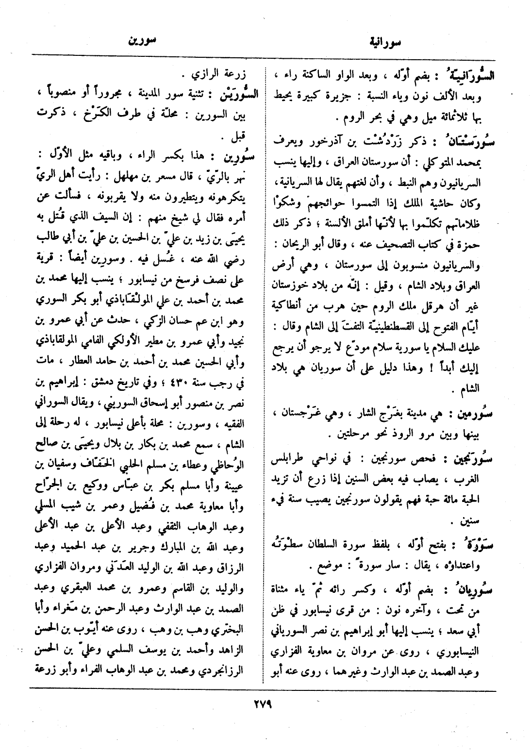 نهر بالرّيّ، قال مسعر بن مهلهل: رأيت أهل الريّ يتكرهونه ويتطيرون منه ولا يقربونه، فسألت عن أمره فقال لي شيخ منهم: إن السيف الذي قتل به يحيى بن زيد بن عليّ بن الحسين بن عليّ بن أبي طالب رضي الله عنه، غسل فيه. وسورين أيضا: قرية على نصف فرسخ من نيسابور، ينسب إليها محمد بن محمد بن أحمد بن علي المولقاباذي أبو بكر السوري وهو ابن عم حسان الزكي، حدث عن أبي عمرو بن نجيد وأبي عمرو بن مطير الأولكي الفامي المولقاباذي وأبي الحسين محمد بن أحمد بن حامد العطار، مات في رجب سنة 430، وفي تاريخ دمشق: إبراهيم بن نصر بن منصور أبو إسحاق السوريني، ويقال السوراني الفقيه، وسورين: محلة بأعلى نيسابور، له رحلة إلى الشام، سمع محمد بن بكار بن بلال ويحيى بن صالح الوحاظي وعطاء بن مسلم الحلبي الخفّاف وسفيان بن عيينة وأبا مسلم بكر بن عبّاس ووكيع بن الجرّاح وأبا معاوية محمد بن فضيل وعمر بن شيب المسلي وعبد الوهاب الثقفي وعبد الأعلى بن عبد الأعلى وعبد الله بن المبارك وجرير بن عبد الحميد وعبد الرزاق وعبد الله بن الوليد العدني ومروان الفزاري والوليد بن القاسم وعمرو بن محمد العبقري وعبد الصمد بن عبد الوارث وعبد الرحمن بن مغراء وأبا البختري وهب بن وهب، روى عنه أيّوب بن الحسن الزاهد وأحمد بن يوسف السلمي وعليّ بن الحسن الرزانجردي ومحمد بن عبد الوهاب الفراء وأبو زرعة