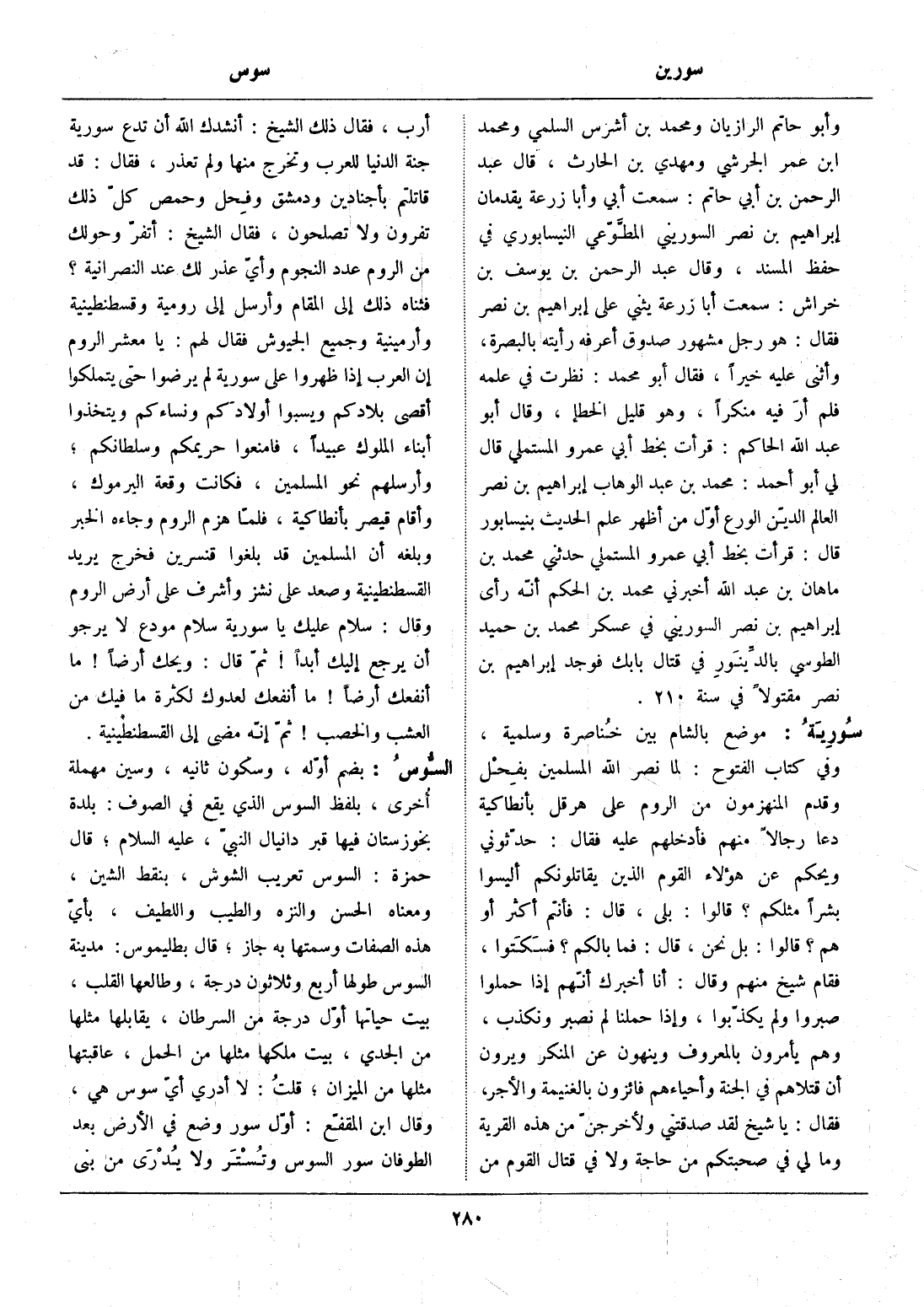 فثناه ذلك إلى المقام وأرسل إلى رومية وقسطنطينية وأرمينية وجميع الجيوش فقال لهم: يا معشر الروم إن العرب إذا ظهروا على سورية لم يرضوا حتى يتملكوا أقصى بلادكم ويسبوا أولادكم ونساءكم ويتخذوا أبناء الملوك عبيدا، فامنعوا حريمكم وسلطانكم، وأرسلهم نحو المسلمين، فكانت وقعة اليرموك، وأقام قيصر بأنطاكية، فلمّا هزم الروم وجاءه الخبر وبلغه أن المسلمين قد بلغوا قنسرين فخرج يريد القسطنطينية وصعد على نشز وأشرف على أرض الروم وقال: سلام عليك يا سورية سلام مودع لا يرجو أن يرجع إليك أبدا! ثمّ قال: ويحك أرضا! ما أنفعك أرضا! ما أنفعك لعدوك لكثرة ما فيك من العشب والخصب! ثمّ إنّه مضى إلى القسطنطينية.