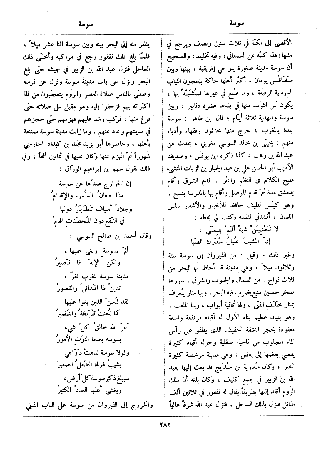 الأقصى إلى مكّة في ثلاث سنين ونصف ويرجع في مثلها، هذا كلّه عن السمعاني، وفيه تخليط، والصحيح أن سوسة مدينة صغيرة بنواحي إفريقية، بينها وبين سفاقس يومان، أكثر أهلها حاكة ينسجون الثياب السوسية الرفيعة، وما صنع في غيرها فمشبّه بها، يكون ثمن الثوب منها في بلدها عشرة دنانير، وبين سوسة والمهدية ثلاثة أيّام، قال ابن طاهر: سوسة بلدة بالمغرب، خرج منها محدثون وفقهاء وأدباء منهم: يحيى بن خالد السوسي مغربي، يحدث عن عبد الله بن وهب، كذا ذكره ابن يونس، وصديقنا الأديب أبو الحسن علي بن عبد الجبار بن الزيات المنشئ مليح الكلام في النظم والنثر، قدم الشرق وأقام بدمشق مدة ثمّ قدم الموصل وأقام بها بالمدرسة ينسخ، وهو كيّس لطيف حافظ للأخبار والأشعار سلس اللسان، أنشدني لنفسه وكتب لي بخطه: