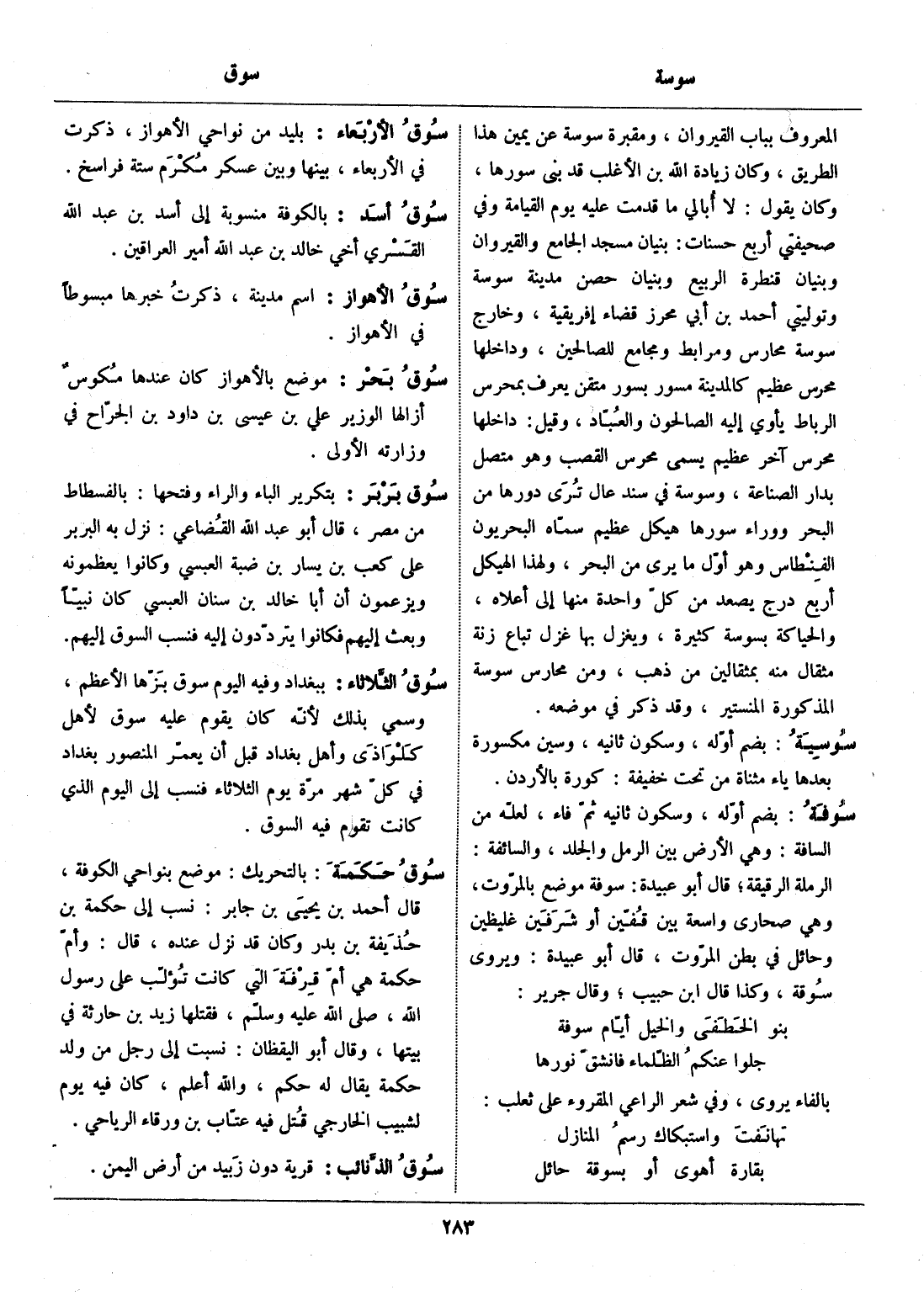 المعروف بباب القيروان، ومقبرة سوسة عن يمين هذا الطريق، وكان زيادة الله بن الأغلب قد بنى سورها، وكان يقول: لا أبالي ما قدمت عليه يوم القيامة وفي صحيفتي أربع حسنات: بنيان مسجد الجامع والقيروان وبنيان قنطرة الربيع وبنيان حصن مدينة سوسة وتوليتي أحمد بن أبي محرز قضاء إفريقية، وخارج سوسة محارس ومرابط ومجامع للصالحين، وداخلها محرس عظيم كالمدينة مسور بسور متقن يعرف بمحرس الرباط يأوي إليه الصالحون والعبّاد، وقيل: داخلها محرس آخر عظيم يسمى محرس القصب وهو متصل بدار الصناعة، وسوسة في سند عال ترى دورها من البحر ووراء سورها هيكل عظيم سمّاه البحريون الفنطاس وهو أوّل ما يرى من البحر، ولهذا الهيكل أربع درج يصعد من كلّ واحدة منها إلى أعلاه، والحياكة بسوسة كثيرة، ويغزل بها غزل تباع زنة مثقال منه بمثقالين من ذهب، ومن محارس سوسة المذكورة المنستير، وقد ذكر في موضعه.