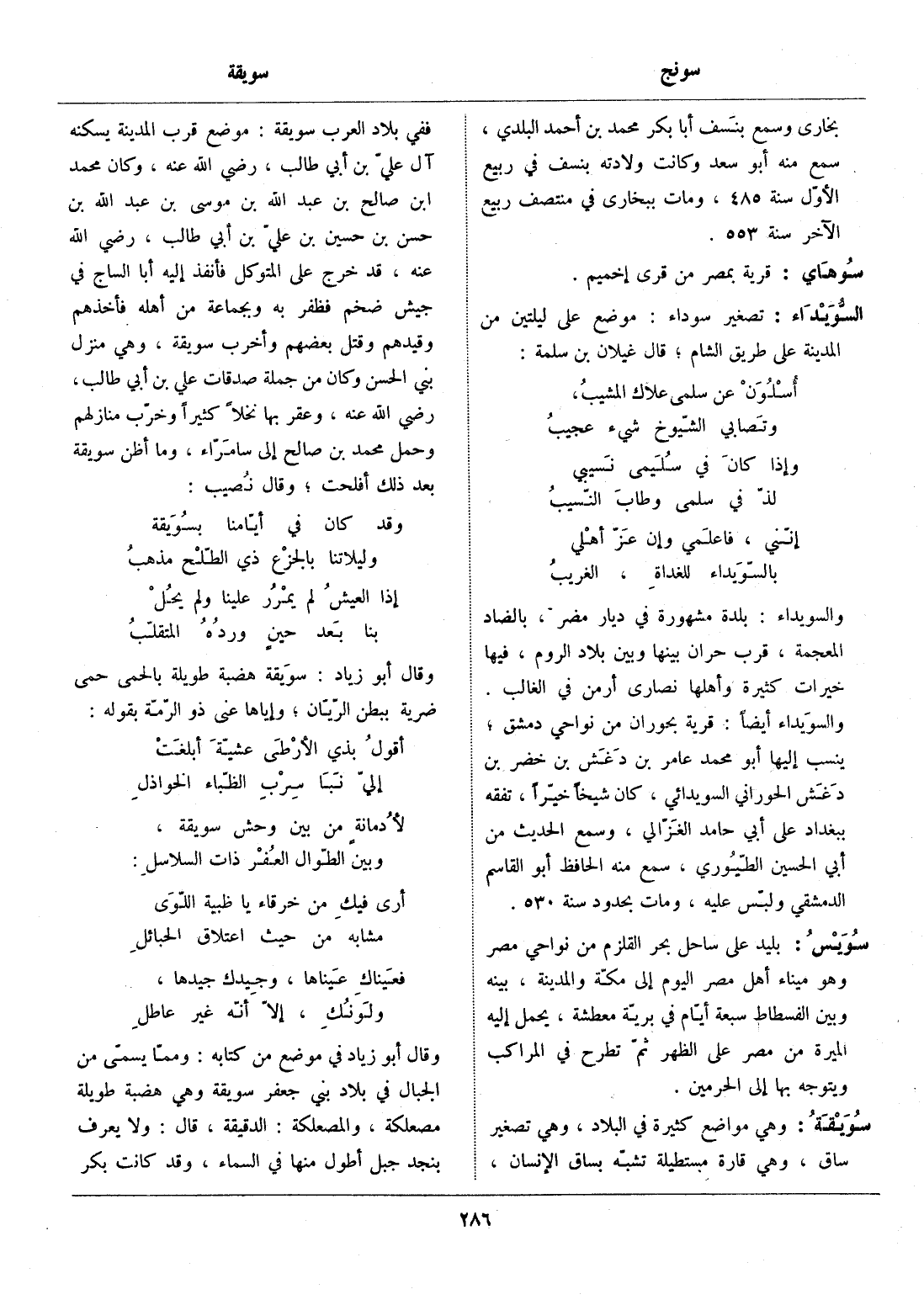 وهي مواضع كثيرة في البلاد، وهي تصغير ساق، وهي قارة مستطيلة تشبّه بساق الإنسان، ففي بلاد العرب سويقة: موضع قرب المدينة يسكنه آل عليّ بن أبي طالب، رضي الله عنه، وكان محمد ابن صالح بن عبد الله بن موسى بن عبد الله بن حسن بن حسين بن عليّ بن أبي طالب، رضي الله عنه، قد خرج على المتوكل فأنفذ إليه أبا الساج في جيش ضخم فظفر به وبجماعة من أهله فأخذهم وقيدهم وقتل بعضهم وأخرب سويقة، وهي منزل بني الحسن وكان من جملة صدقات علي بن أبي طالب، رضي الله عنه، وعقر بها نخلا كثيرا وخرّب منازلهم وحمل محمد بن صالح إلى سامرّاء، وما أظن سويقة بعد ذلك أفلحت، وقال نصيب: