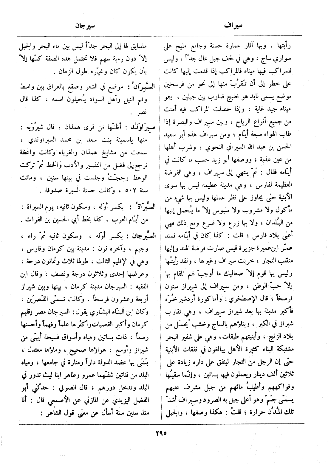 رأيتها، وبها آثار عمارة حسنة وجامع مليح على سواري ساج، وهي في لحف جبل عال جدّا، وليس للمراكب فيها ميناء فالمراكب إذا قدمت إليها كانت على خطر إلى أن تقرب منها إلى نحو من فرسخين موضع يسمى نابد هو خليج ضارب بين جبلين، وهو ميناء جيد غاية، وإذا حصلت المراكب فيه أمنت من جميع أنواع الرياح، وبين سيراف والبصرة إذا طاب الهواء سبعة أيّام، ومن سيراف هذه أبو سعيد الحسن بن عبد الله السيرافي النحوي، وشرب أهلها من عين عذبة، ووصفها أبو زيد حسب ما كانت في أيّامه فقال: ثمّ ينتهي إلى سيراف، وهي الفرضة العظيمة لفارس، وهي مدينة عظيمة ليس بها سوى الأبنية حتى يجاوز على نظر عملها وليس بها شيء من مأكول ولا مشروب ولا ملبوس إلّا ما يحمل إليها من البلدان، ولا بها زرع ولا ضرع ومع ذلك فهي أغنى بلاد فارس، قلت: كذا كان في أيّامه فمنذ عمّر ابن عميرة جزيرة قيس صارت فرضة الهند وإليها منقلب التجار، خربت سيراف وغيرها، ولقد رأيتها وليس بها قوم إلّا صعاليك ما أوجب لهم المقام بها إلّا حبّ الوطن، ومن سيراف إلى شيراز ستون فرسخا، قال الإصطخري: وأما كورة أردشير خرّه فأكبر مدينة بها بعد شيراز سيراف، وهي تقارب شيراز في الكبر، وبناؤهم بالساج وخشب يحمل من بلاد الزنج، وأبنيتهم طبقات، وهي على شفير البحر مشتبكة البناء كثيرة الأهل يبالغون في نفقات الأبنية حتى إن الرجل من التجار لينفق على داره زيادة على ثلاثين ألف دينار ويعملون فيها بساتين، وإنّما سقيها وفواكههم وأطيب مائهم من جبل مشرف عليهم يسمّى جمّ وهو أعلى جبل به الصرود وسيراف أشدّ تلك المدن حرارة، قلت: هكذا وصفها، والجبل مضايق لها إلى البحر جدّا ليس بين ماء البحر والجبل إلّا دون رمية سهم فلا تحتمل هذه الصفة كلّها إلّا بأن يكون كان وغيّره طول الزمان.