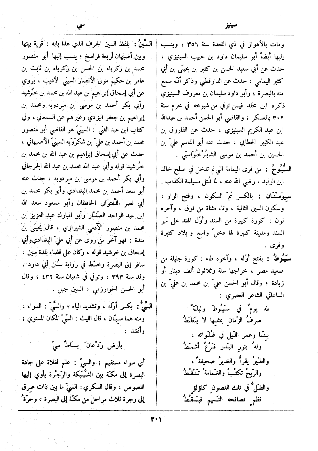 بلفظ السين الحرف الذي هذا بابه: قرية بينها وبين أصبهان أربعة فراسخ، ينسب إليها أبو منصور محمد بن زكرياء بن الحسن بن زكرياء بن ثابت بن عامر بن حكيم مولى الأنصار السيني الأديب، يروي عن أبي إسحاق إبراهيم بن عبد الله بن محمد بن خرشيد وأبي بكر أحمد بن موسى بن مردويه ومحمد بن إبراهيم بن جعفر اليزدي وغيرهم عن السمعاني، وفي كتاب ابن عبد الغني: السينيّ هو القاضي أبو منصور محمد بن أحمد بن عليّ بن شكرويه السينيّ الأصبهاني، حدث عن أبي إسحاق إبراهيم بن عبد الله بن محمد بن خرشيد قوله وأبي عبد الله محمد بن عبد الله الجرجاني وأبي بكر أحمد بن موسى بن مردويه، حدث عنه أبو سعد أحمد بن محمد البغدادي وأبو بكر محمد بن أبي نصر اللّفتواني الحافظان وأبو مسعود سعد الله ابن عبد الواحد الصّفّار وأبو المبارك عبد العزيز، محمد بن منصور الآدمي الشيرازي، قال يحيى بن مندة: فهو آخر من روى عن أبي عليّ البغدادي وأبي إسحاق بن خرشيد قوله، وكان على قضاء بلدة سين، سافر إلى البصرة وخلّط في رواية سنن أبي داود، ولد سنة 393، وتوفي في شعبان سنة 432، وقال أبو الحسن الخوارزمي: السين جبل.