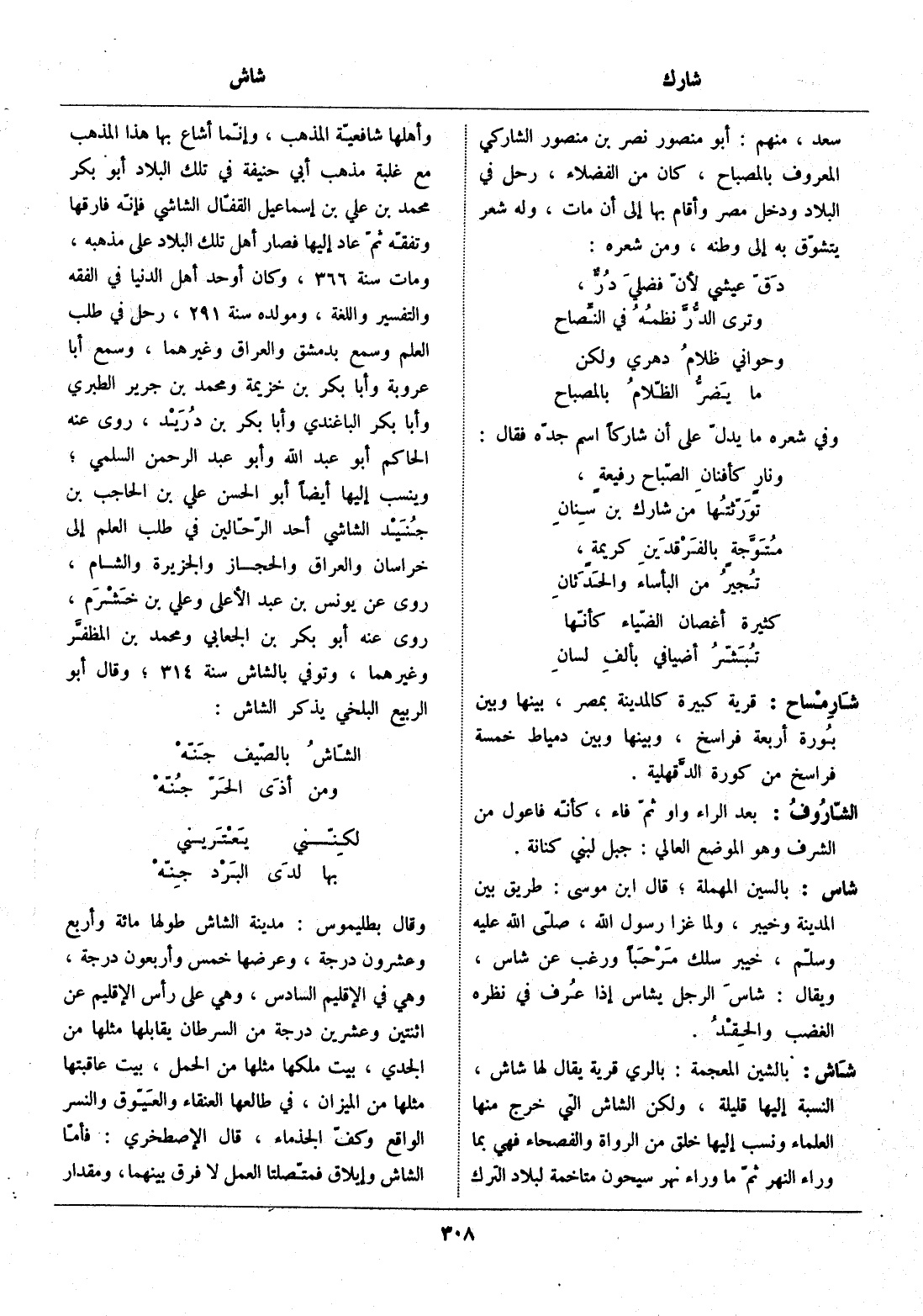 بالشين المعجمة: بالري قرية يقال لها شاش، النسبة إليها قليلة، ولكن الشاش التي خرج منها العلماء ونسب إليها خلق من الرواة والفصحاء فهي بما وراء النهر ثمّ ما وراء نهر سيحون متاخمة لبلاد الترك وأهلها شافعيّة المذهب، وإنّما أشاع بها هذا المذهب مع غلبة مذهب أبي حنيفة في تلك البلاد أبو بكر محمد بن علي بن إسماعيل القفّال الشاشي فإنّه فارقها وتفقّه ثمّ عاد إليها فصار أهل تلك البلاد على مذهبه، ومات سنة 366، وكان أوحد أهل الدنيا في الفقه والتفسير واللغة، ومولده سنة 291، رحل في طلب العلم وسمع بدمشق والعراق وغيرهما، وسمع أبا عروبة وأبا بكر بن خزيمة ومحمد بن جرير الطبري وأبا بكر الباغندي وأبا بكر بن دريد، روى عنه الحاكم أبو عبد الله وأبو عبد الرحمن السلمي، وينسب إليها أيضا أبو الحسن علي بن الحاجب بن جنيد الشاشي أحد الرّحّالين في طلب العلم إلى خراسان والعراق والحجاز والجزيرة والشام، روى عن يونس بن عبد الأعلى وعلي بن خشرم، روى عنه أبو بكر بن الجعابي ومحمد بن المظفّر وغيرهما، وتوفي بالشاش سنة 314، وقال أبو الربيع البلخي يذكر الشاش: