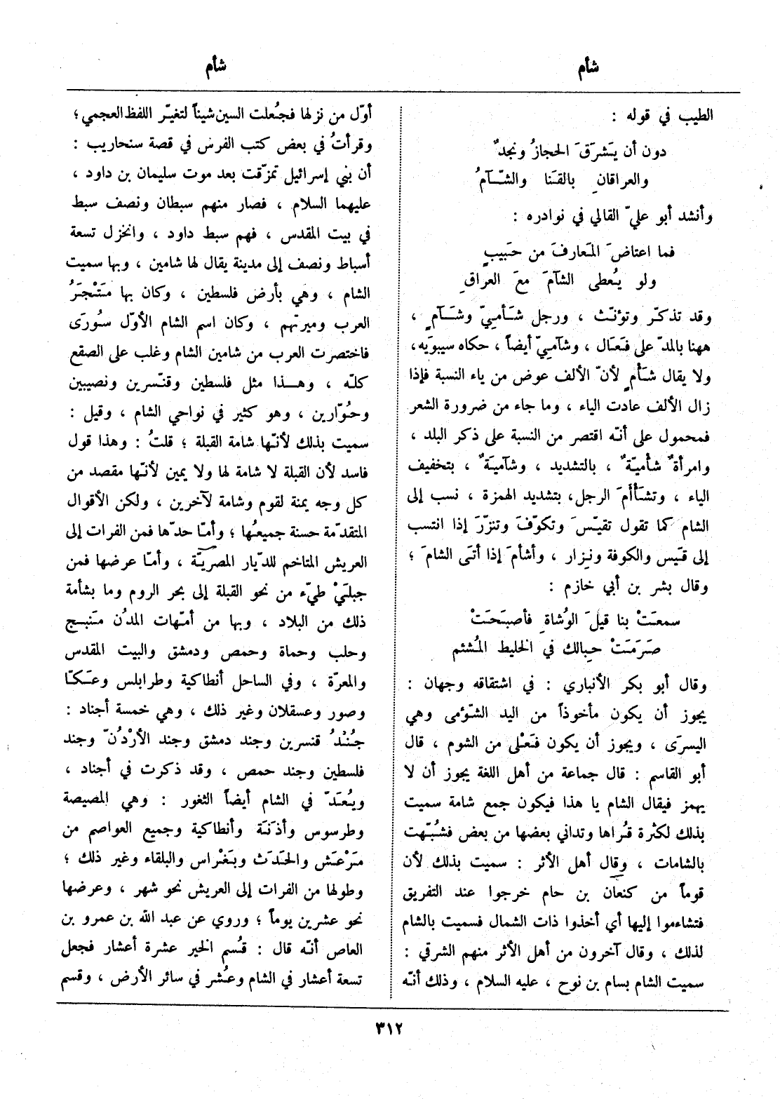 وقد تذكّر وتؤنّث، ورجل شأميّ وشآم، ههنا بالمدّ على فعال، وشآميّ أيضا، حكاه سيبويه، ولا يقال شأم لأنّ الألف عوض من ياء النسبة فإذا زال الألف عادت الياء، وما جاء من ضرورة الشعر فمحمول على أنّه اقتصر من النسبة على ذكر البلد، وامرأة شأميّة، بالتشديد، وشآمية، بتخفيف الياء، وتشاءم الرجل، بتشديد الهمزة، نسب إلى الشام كما تقول تقيّس وتكوّف وتنزّر إذا انتسب إلى قيس والكوفة ونزار، وأشأم إذا أتى الشام، وقال بشر بن أبي خازم: