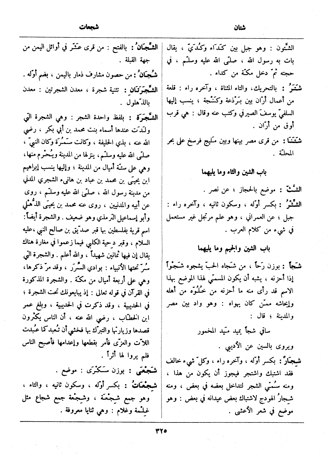 اسم قرية بفلسطين بها قبر صدّيق بن صالح النبي، عليه السلام، وقبر دحية الكلبي فيما زعموا في مغارة هناك يقال إن فيها ثمانين شهيدا، والله أعلم. والشجرة التي سرّ تحتها الأنبياء: بوادي السّرر، وقد مرّ ذكرها، وهي على أربعة أميال من مكّة. والشجرة المذكورة في القرآن في قوله تعالى: إِذْ يُبايِعُونَكَ تَحْتَ الشَّجَرَةِ 48: 18، في الحديبية، وقد ذكرت في الحديبية، وبلغ عمر ابن الخطّاب، رضي الله عنه، أن الناس يكثرون قصدها وزيارتها والتبرّك بها فخشي أن تعبد كما عبدت اللّات والعزّى فأمر بقطعها وإعدامها فأصبح الناس فلم يروا لها أثرا.