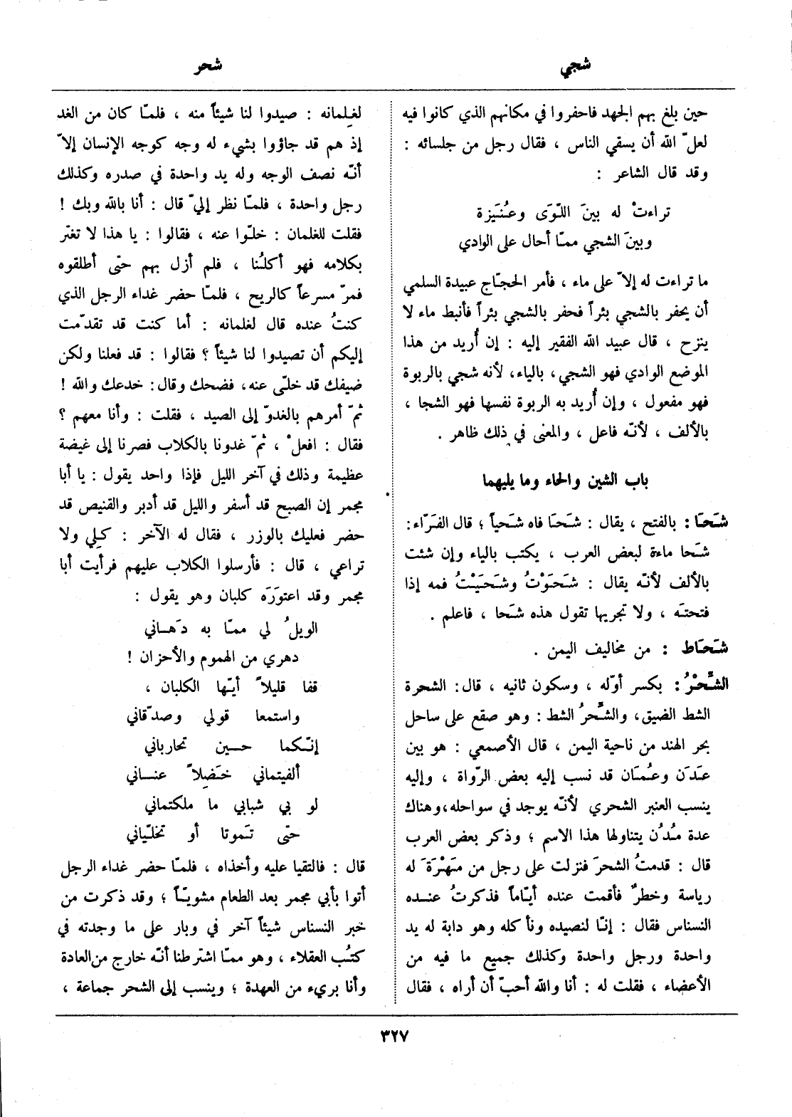 ما تراءت له إلّا على ماء، فأمر الحجّاج عبيدة السلمي أن يحفر بالشجي بئرا فحفر بالشجي بئرا فأنبط ماء لا ينزح، قال عبيد الله الفقير إليه: إن أريد من هذا الموضع الوادي فهو الشجي، بالياء، لأنه شجي بالربوة فهو مفعول، وإن أريد به الربوة نفسها فهو الشجا، بالألف، لأنّه فاعل، والمعنى في ذلك ظاهر.