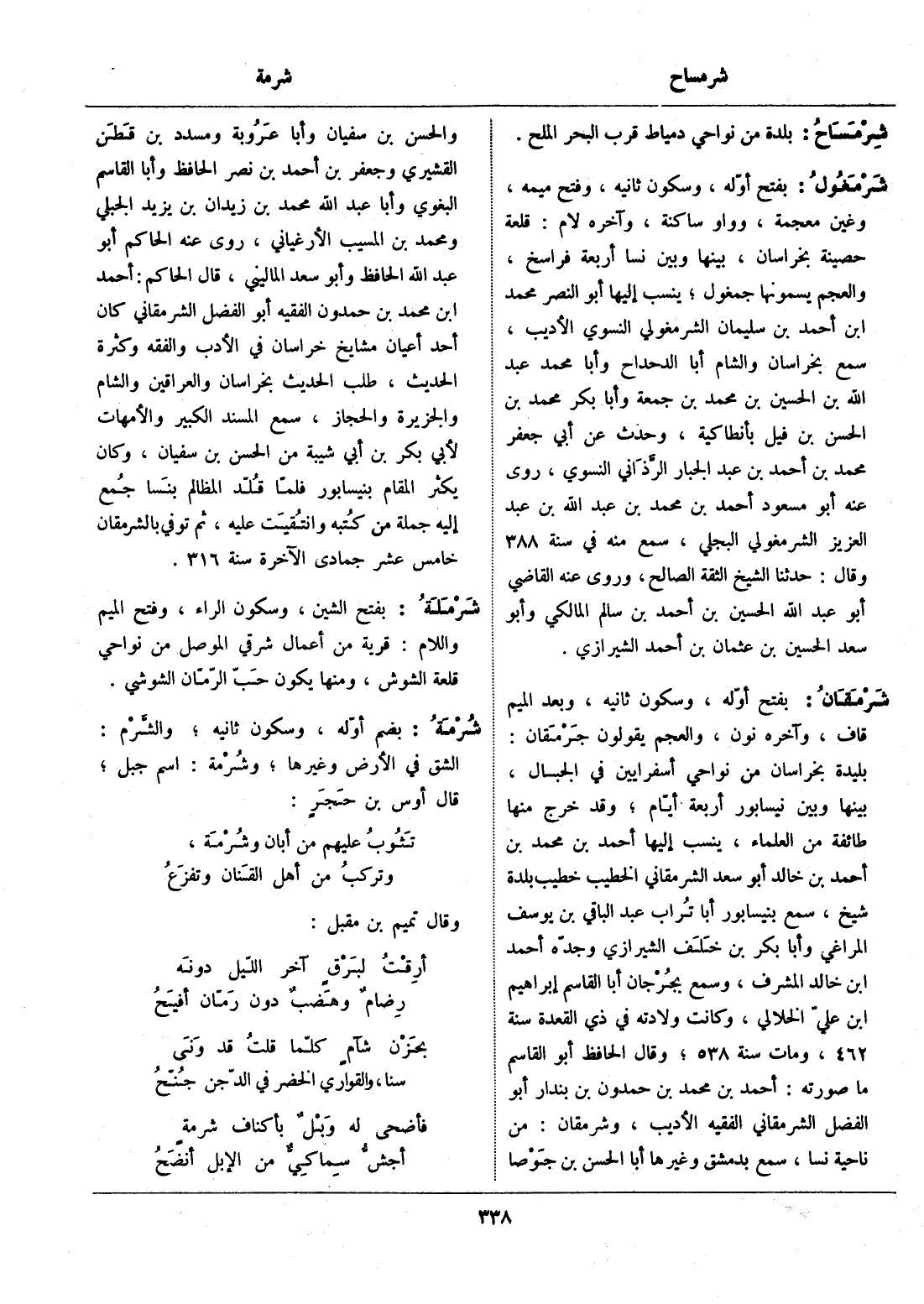 بليدة بخراسان من نواحي أسفرايين في الجبال، بينها وبين نيسابور أربعة أيّام، وقد خرج منها طائفة من العلماء، ينسب إليها أحمد بن محمد بن أحمد بن خالد أبو سعد الشرمقاني الخطيب خطيب بلدة شيخ، سمع بنيسابور أبا تراب عبد الباقي بن يوسف المراغي وأبا بكر بن خلف الشيرازي وجدّه أحمد ابن خالد المشرف، وسمع بجرجان أبا القاسم إبراهيم ابن عليّ الخلالي، وكانت ولادته في ذي القعدة سنة 462، ومات سنة 538، وقال الحافظ أبو القاسم ما صورته: أحمد بن محمد بن حمدون بن بندار أبو الفضل الشرمقاني الفقيه الأديب، وشرمقان: من ناحية نسا، سمع بدمشق وغيرها أبا الحسن بن جوصا والحسن بن سفيان وأبا عروبة ومسدد بن قطن القشيري وجعفر بن أحمد بن نصر الحافظ وأبا القاسم البغوي وأبا عبد الله محمد بن زيدان بن يزيد الجبلي ومحمد بن المسيب الأرغياني، روى عنه الحاكم أبو عبد الله الحافظ وأبو سعد الماليني، قال الحاكم: أحمد ابن محمد بن حمدون الفقيه أبو الفضل الشرمقاني كان أحد أعيان مشايخ خراسان في الأدب والفقه وكثرة الحديث، طلب الحديث بخراسان والعراقين والشام والجزيرة والحجاز، سمع المسند الكبير والأمهات لأبي بكر بن أبي شيبة من الحسن بن سفيان، وكان يكثر المقام بنيسابور فلمّا قلّد المظالم بنسإ جمع إليه جملة من كتبه وانتقيت عليه، ثم توفي بالشرمقان خامس عشر جمادى الآخرة سنة 316.
