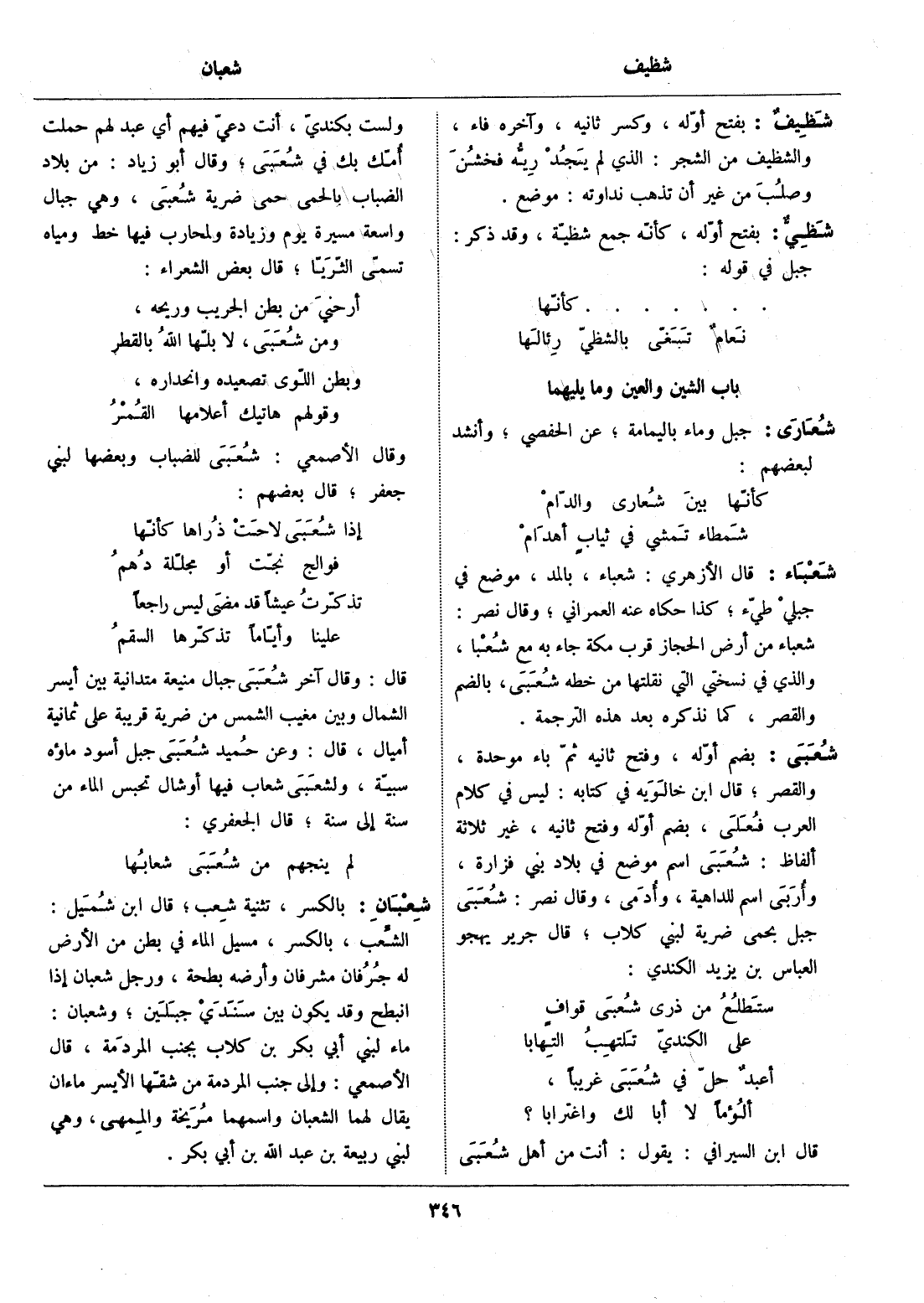 إذا شعبى لاحت ذراها كأنّها فوالج نجّت أو مجلّلة دهم تذكّرت عيشا قد مضى ليس راجعا علينا وأيّاما تذكّرها السقم قال: وقال آخر شعبى جبال منيعة متدانية بين أيسر الشمال وبين مغيب الشمس من ضرية قريبة على ثمانية أميال، قال: وعن حميد شعبى جبل أسود ماؤه سبيّة، ولشعبى شعاب فيها أوشال تحبس الماء من سنة إلى سنة، قال الجعفري: