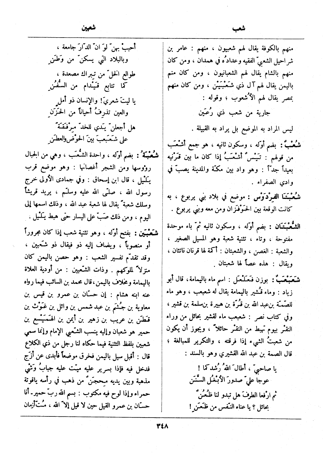 بفتح أوّله، وهو تثنية شعب إذا كان مجرورا أو منصوبا، ويضاف إليه ذو فيقال ذو شعبين، وقد تقدّم تفسير الشعب: وهو حصن باليمن كان منزلا لملوكهم. وذات الشّعبين: من أودية العلاة باليمامة ومخلاف باليمن، قال محمد بن السائب فيما رواه عنه ابنه هشام: إن حسّان بن عمرو بن قيس بن معاوية بن جشم بن عبد شمس بن وائل بن غوث بن قطن بن عريب بن زهير بن أيمن بن الهميسع بن حمير هو شعبان وإليه ينسب الشّعبي الإمام وإنما سمي شعبين بلفظ التثنية فيما حكاه لنا رجل من ذي الكلاع قال: أقبل سيل باليمن فخرق موضعا فأبدى عن أزج فدخل فيه فإذا بسرير عليه ميّت عليه جباب وشي مذهبة وبين يديه محجن من ذهب في رأسه ياقوتة حمراء وإذا لوح فيه مكتوب: بسم الله ربّ حمير- أنا حسّان بن عمرو القيل حين لا قيل إلّا الله، متّ أزمان