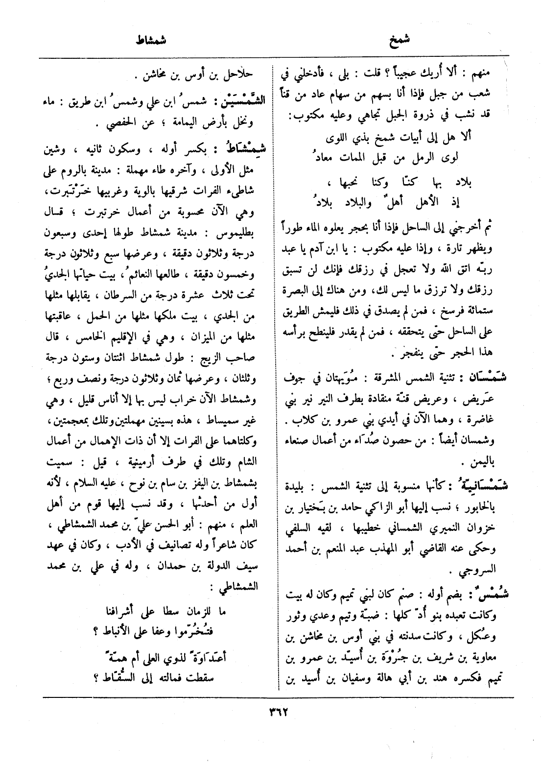 كأنها منسوبة إلى تثنية الشمس: بليدة بالخابور، نسب إليها أبو الزاكي حامد بن بختيار بن خزوان النميري الشمساني خطيبها، لقيه السلفي وحكى عنه القاضي أبو المهذب عبد المنعم بن أحمد السروجي.