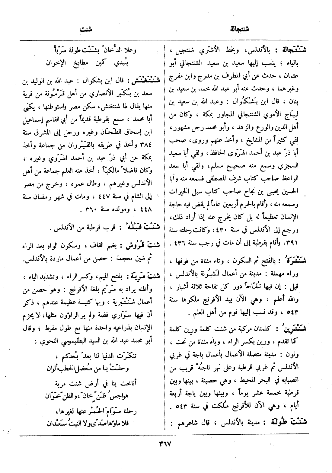 بالأندلس، وبخط الأشتري شنتجيل، بالياء، ينسب إليها سعيد بن سعيد الشنتجالي أبو عثمان، حدث عن أبي المطرف بن مدرج وابن مفرج وغيرهما، وحدث عنه أبو عبد الله محمد بن سعيد بن بنان، قال ابن بشكوال: وعبد الله بن سعيد بن لباج الأموي الشنتجالي المجاور بمكة، وكان من أهل الدين والورع والزهد، وأبو محمد رجل مشهور، لقي كثيرا من المشايخ، وأخذ عنهم وروى، صحب أبا ذرّ عبد بن أحمد الهروي الحافظ، ولقي أبا سعيد السجزي وسمع منه صحيح مسلم، ولقي أبا سعد الواعظ صاحب كتاب شرف المصطفى فسمعه منه وأبا الحسين يحيى بن نجاح صاحب كتاب سبل الخيرات وسمعه منه، وأقام بالحرم أربعين عاما لم يقض فيه حاجة الإنسان تعظيما له بل كان يخرج عنه إذا أراد ذلك، ورجع إلى الأندلس في سنة 430، وكانت رحلته سنة 391، وأقام بقرطبة إلى أن مات في رجب سنة 436.
