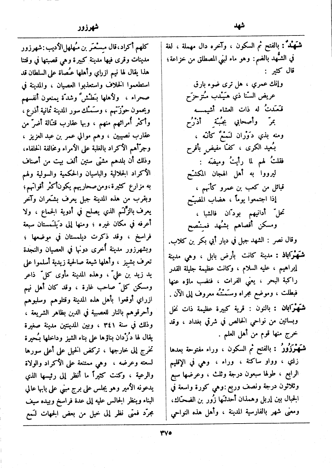 بالفتح ثم السكون، وراء مفتوحة بعدها زاي، وواو ساكنة، وراء، وهي في الإقليم الرابع، طولها سبعون درجة وثلث، وعرضها سبع وثلاثون درجة ونصف وربع: وهي كورة واسعة في الجبال بين إربل وهمذان أحدثها زور بن الضحّاك، ومعنى شهر بالفارسية المدينة، وأهل هذه النواحي كلهم أكراد، قال مسعر بن مهلهل الأديب: شهرزور مدينات وقرى فيها مدينة كبيرة وهي قصبتها في وقتنا هذا يقال لها نيم ازراي وأهلها عصاة على السلطان قد استطعموا الخلاف واستعذبوا العصيان، والمدينة في صحراء، ولأهلها بطش وشدّة يمنعون أنفسهم ويحمون حوزتهم، وسمك سور المدينة ثمانية أذرع، وأكثر أمرائهم منهم، وبها عقارب قتّالة أضرّ من عقارب نصيبين، وهم موالي عمر بن عبد العزيز، وجرّأهم الأكراد بالغلبة على الأمراء ومخالفة الخلفاء، وذلك أن بلدهم مشتى ستين ألف بيت من أصناف الأكراد الجلالية والباسيان والحكمية والسولية ولهم به مزارع كثيرة، ومن صحاريهم يكون أكثر أقواتهم، وبقرب من هذه المدينة جبل يعرف بشعران وآخر يعرف بالزّلم الذي يصلح في أدوية الجماع، ولا أعرفه في مكان غيره، ومنها إلى ديلمستان سبعة فراسخ، وقد ذكرت ديلمستان في موضعها، وبشهرزور مدينة أخرى دونها في العصيان والنجدة تعرف بشيز، وأهلها شيعة صالحية زيدية أسلموا على يد زيد بن عليّ، وهذه المدينة مأوى كلّ ذاعر ومسكن كلّ صاحب غارة، وقد كان أهل نيم ازراي أوقعوا بأهل هذه المدينة وقتلوهم وسلبوهم وأحرقوهم بالنار للعصبية في الدين بظاهر الشريعة، وذلك في سنة 341، وبين المدينتين مدينة صغيرة يقال لها دزدان بناؤها على بناء الشيز وداخلها بحيرة تخرج إلى خارجها، تركض الخيل على أعلى سورها لسعته وعرضه، وهي ممتنعة على الأكراد والولاة والرعية، وكنت كثيرا ما أنظر إلى رئيسها الذي يدعونه الأمير وهو يجلس على برج مبني على بابها عالي البناء وينظر الجالس عليه إلى عدة فراسخ وبيده سيف مجرّد فمتى نظر إلى خيل من بعض الجهات لمع