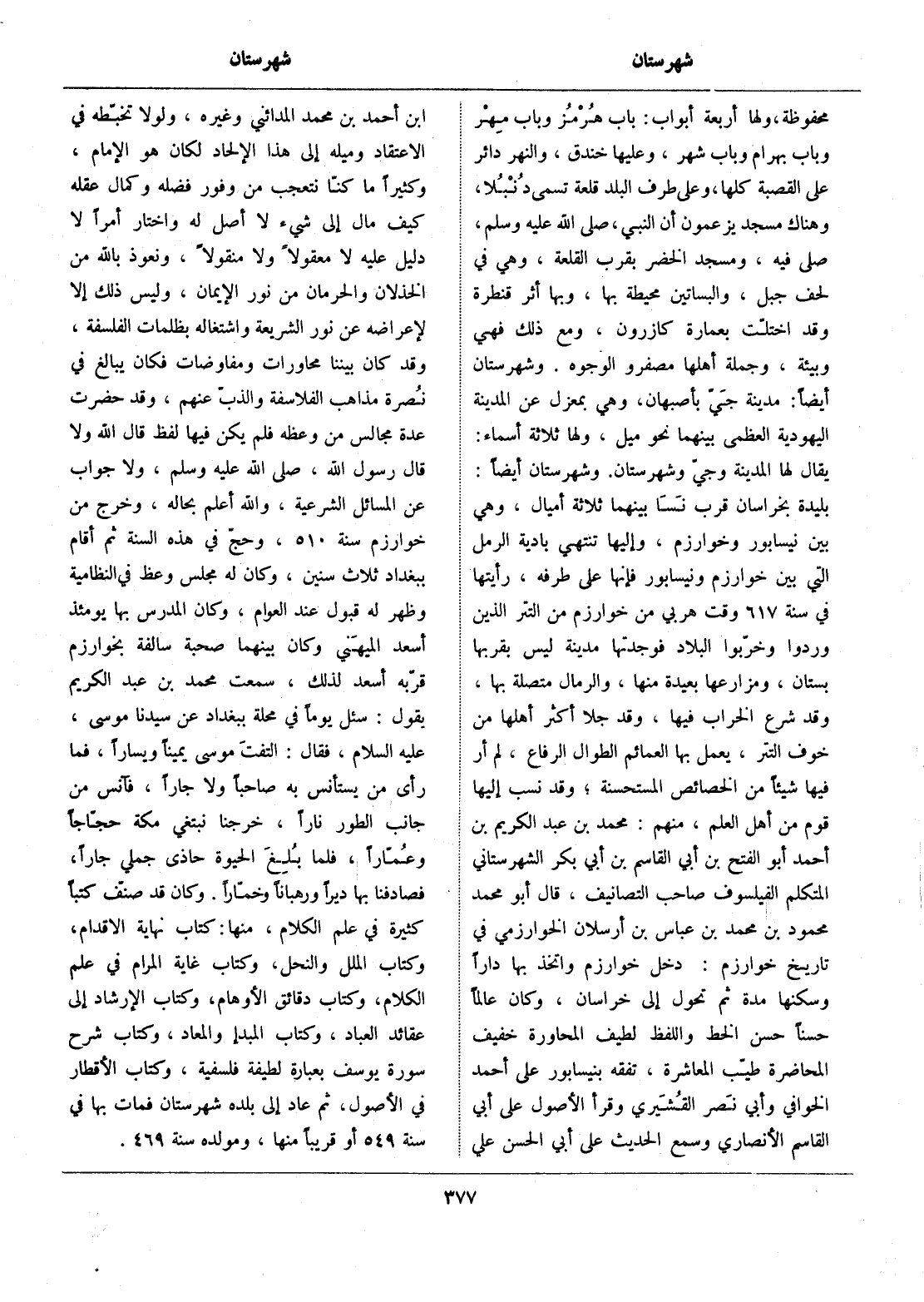 بليدة بخراسان قرب نسا بينهما ثلاثة أميال، وهي بين نيسابور وخوارزم، وإليها تنتهي بادية الرمل التي بين خوارزم ونيسابور فإنها على طرفه، رأيتها في سنة 617 وقت هربي من خوارزم من التتر الذين وردوا وخرّبوا البلاد فوجدتها مدينة ليس بقربها بستان، ومزارعها بعيدة منها، والرمال متصلة بها، وقد شرع الخراب فيها، وقد جلا أكثر أهلها من خوف التتر، يعمل بها العمائم الطوال الرفاع، لم أر فيها شيئا من الخصائص المستحسنة، وقد نسب إليها قوم من أهل العلم، منهم: محمد بن عبد الكريم بن أحمد أبو الفتح بن أبي القاسم بن أبي بكر الشهرستاني المتكلم الفيلسوف صاحب التصانيف، قال أبو محمد محمود بن محمد بن عباس بن أرسلان الخوارزمي في تاريخ خوارزم: دخل خوارزم واتخذ بها دارا وسكنها مدة ثم تحول إلى خراسان، وكان عالما حسنا حسن الخط واللفظ لطيف المحاورة خفيف المحاضرة طيّب المعاشرة، تفقه بنيسابور على أحمد الخوافي وأبي نصر القشيري وقرأ الأصول على أبي القاسم الأنصاري وسمع الحديث على أبي الحسن علي ابن أحمد بن محمد المدائني وغيره، ولولا تخبّطه في الاعتقاد وميله إلى هذا الإلحاد لكان هو الإمام، وكثيرا ما كنّا نتعجب من وفور فضله وكمال عقله كيف مال إلى شيء لا أصل له واختار أمرا لا دليل عليه لا معقولا ولا منقولا، ونعوذ بالله من الخذلان والحرمان من نور الإيمان، وليس ذلك إلا لإعراضه عن نور الشريعة واشتغاله بظلمات الفلسفة، وقد كان بيننا محاورات ومفاوضات فكان يبالغ في نصرة مذاهب الفلاسفة والذبّ عنهم، وقد حضرت عدة مجالس من وعظه فلم يكن فيها لفظ قال الله ولا قال رسول الله، صلى الله عليه وسلم، ولا جواب عن المسائل الشرعية، والله أعلم بحاله، وخرج من خوارزم سنة 510، وحجّ في هذه السنة ثم أقام ببغداد ثلاث سنين، وكان له مجلس وعظ في النظامية وظهر له قبول عند العوام، وكان المدرس بها يومئذ أسعد الميهني وكان بينهما صحبة سالفة بخوارزم قرّبه أسعد لذلك، سمعت محمد بن عبد الكريم يقول: سئل يوما في محلة ببغداد عن سيدنا موسى، عليه السلام، فقال: التفت موسى يمينا ويسارا، فما رأى من يستأنس به صاحبا ولا جارا، فآنس من جانب الطور نارا، خرجنا نبتغي مكة حجّاجا وعمّارا، فلما بلغ الحيوة حاذى جملي جارا، فصادفنا بها ديرا ورهبانا وخمّارا. وكان قد صنّف كتبا كثيرة في علم الكلام، منها: كتاب نهاية الاقدام، وكتاب الملل والنحل، وكتاب غاية المرام في علم الكلام، وكتاب دقائق الأوهام، وكتاب الإرشاد إلى عقائد العباد، وكتاب المبدإ والمعاد، وكتاب شرح سورة يوسف بعبارة لطيفة فلسفية، وكتاب الأقطار في الأصول، ثم عاد إلى بلده شهرستان فمات بها في سنة 549 أو قريبا منها، ومولده سنة 469.