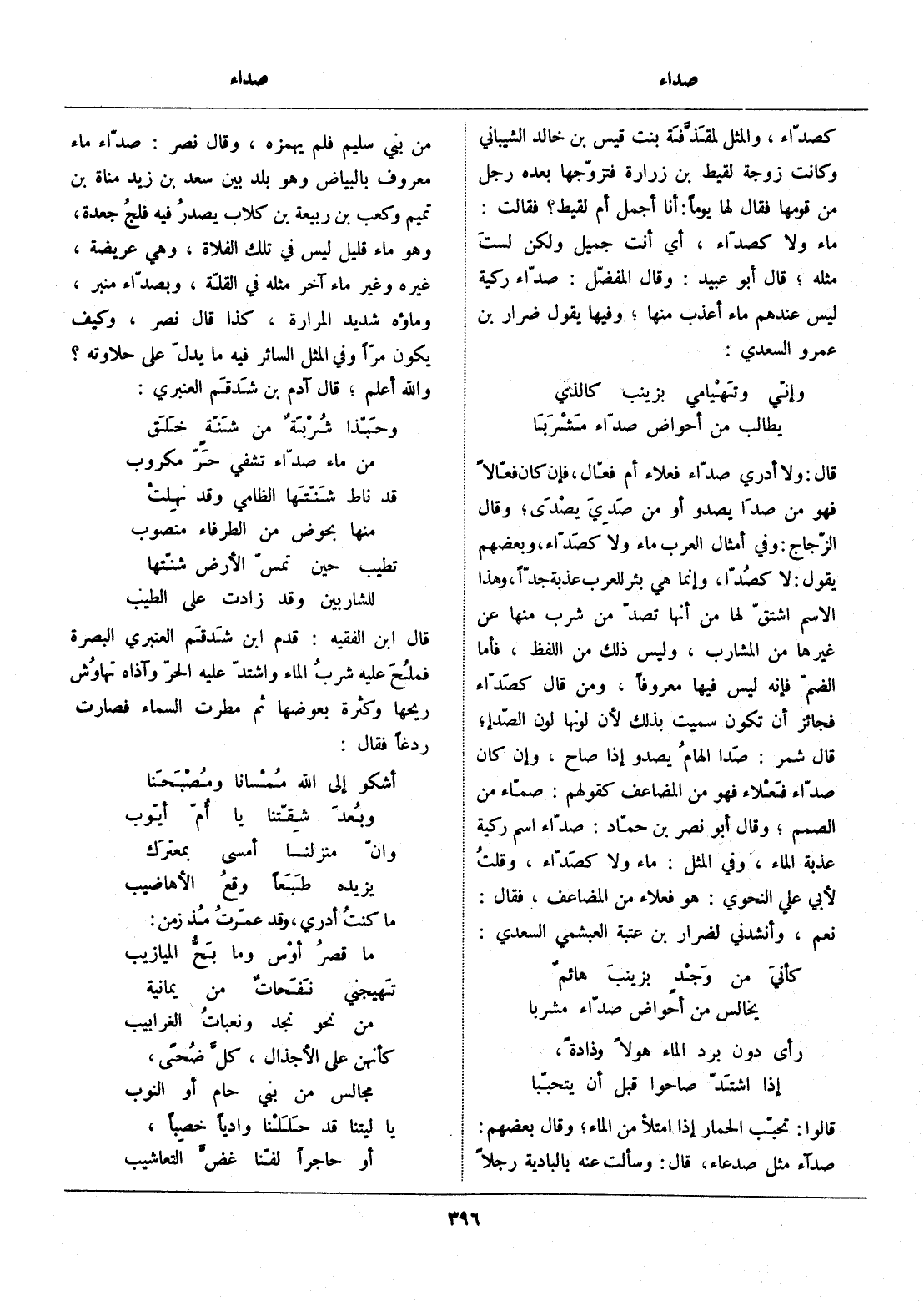 قال: ولا أدري صدّاء فعلاء أم فعّال، فإن كان فعّالا فهو من صدا يصدو أو من صدي يصدى، وقال الزّجاج: وفي أمثال العرب ماء ولا كصدّاء، وبعضهم يقول: لا كصدّا، وإنما هي بئر للعرب عذبة جدّا، وهذا الاسم اشتقّ لها من أنها تصدّ من شرب منها عن غيرها من المشارب، وليس ذلك من اللفظ، فأما الضمّ فإنه ليس فيها معروفا، ومن قال كصدّاء فجائز أن تكون سميت بذلك لأن لونها لون الصّدإ، قال شمر: صدا الهام يصدو إذا صاح، وإن كان صدّاء فعلاء فهو من المضاعف كقولهم: صمّاء من الصمم، وقال أبو نصر بن حمّاد: صدّاء اسم ركية عذبة الماء، وفي المثل: ماء ولا كصدّاء، وقلت لأبي علي النحوي: هو فعلاء من المضاعف، فقال: