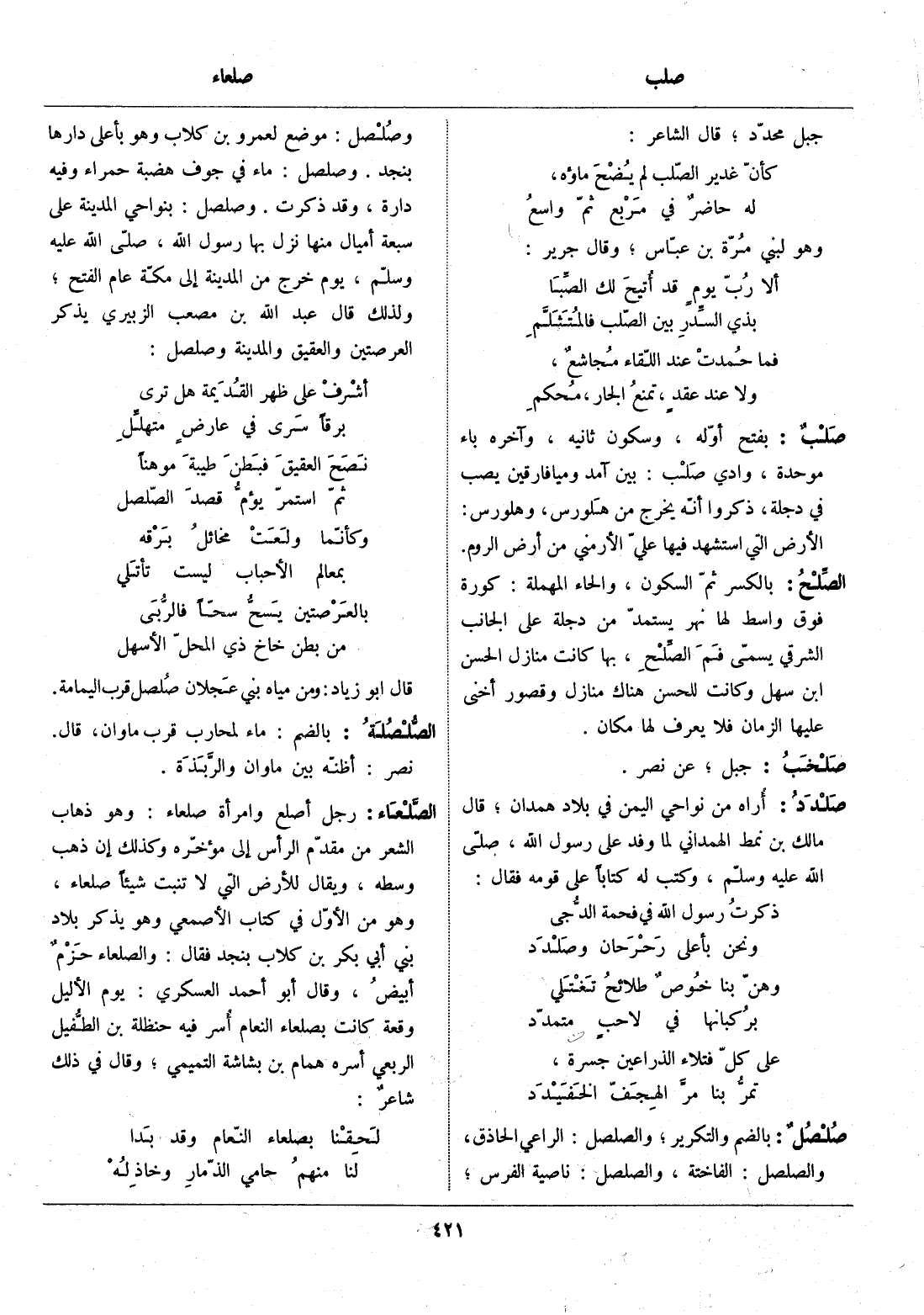 بالضم والتكرير، والصلصل: الراعي الحاذق، والصلصل: الفاختة، والصلصل: ناصية الفرس، وصلصل: موضع لعمرو بن كلاب وهو بأعلى دارها بنجد. وصلصل: ماء في جوف هضبة حمراء وفيه دارة، وقد ذكرت. وصلصل: بنواحي المدينة على سبعة أميال منها نزل بها رسول الله، صلّى الله عليه وسلّم، يوم خرج من المدينة إلى مكّة عام الفتح، ولذلك قال عبد الله بن مصعب الزبيري يذكر العرصتين والعقيق والمدينة وصلصل: