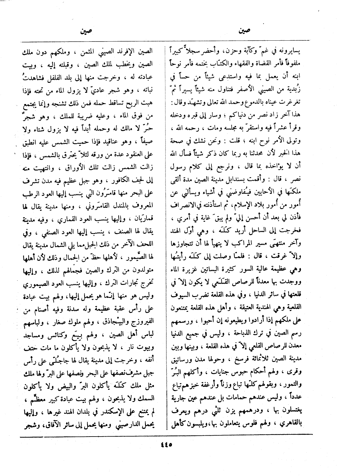 هذا آخر زاد نصر من دنياكم، وسار إلى قبره ودخله وقرأ عشرا فيه واستقرّ به مجلسه ومات، رحمه الله، وتولى الأمر نوح ابنه، قلت: ونحن نشك في صحة هذا الخبر لأن محدثنا به ربما كان ذكر شيئا فسأل الله أن لا يؤاخذه بما قال، ونرجع إلى كلام رسول نصر، قال: وأقمت بسندابل مدينة الصين مدة ألقى ملكها في الأحايين فيفاوضني في أشياء ويسألني عن أمور من أمور بلاد الإسلام، ثم استأذنته في الانصراف فأذن لي بعد أن أحسن إليّ ولم يبق غاية في أمري، فخرجت إلى الساحل أريد كله، وهي أوّل الهند وآخر منتهى مسير المراكب لا يتهيأ لها أن تتجاوزها وإلّا غرقت، قال: فلمّا وصلت إلى كله رأيتها وهي عظيمة عالية السور كثيرة البساتين غزيرة الماء ووجدت بها معدنا للرصاص القلعي لا يكون إلّا في قلعتها في سائر الدنيا، وفي هذه القلعة تضرب السيوف القلعية وهي الهندية العتيقة، وأهل هذه القلعة يمتنعون على ملكهم إذا أرادوا ويطيعونه إن أحبوا، ورسمهم رسم الصين في ترك الذباحة، وليس في جميع الدنيا معدن للرصاص القلعي إلّا في هذه القلعة، وبينها وبين مدينة الصين ثلاثمائة فرسخ، وحولها مدن ورساتيق وقرى، ولهم أحكام حبوس جنايات، وأكلهم البرّ والتمور، وبقولهم كلّها تباع وزنا وأرغفة خبزهم تباع عددا، وليس عندهم حمامات بل عندهم عين جارية يغتسلون بها، ودرهمهم يزن ثلثي درهم ويعرف بالقاهري، ولهم فلوس يتعاملون بها، ويلبسون كأهل الصين الإفرند الصيني المثمن، وملكهم دون ملك الصين ويخطب لملك الصين، وقبلته إليه، وبيت عبادته له، وخرجت منها إلى بلد الفلفل فشاهدت نباته، وهو شجر عاديّ لا يزول الماء من تحته فإذا هبت الريح تساقط حمله فمن ذلك تشنجه وإنما يجتمع من فوق الماء، وعليه ضريبة للملك، وهو شجر حرّ لا مالك له وحمله أبدا فيه لا يزول شتاء ولا صيفا، وهو عناقيد فإذا حميت الشمس عليه انطبق على العنقود عدة من ورقه لئلّا يحترق بالشمس، فإذا زالت الشمس زالت تلك الأوراق، وانتهيت منه إلى لحف الكافور، وهو جبل عظيم فيه مدن تشرف على البحر منها قامرون التي ينسب إليها العود الرطب المعروف بالمندل القامروني، ومنها مدينة يقال لها قماريان، وإليها ينسب العود القماري، وفيه مدينة يقال لها الصنف، ينسب إليها العود الصنفي، وفي اللحف الآخر من ذلك الجبل مما يلي الشمال مدينة يقال لها الصّيمور، لأهلها حظّ من الجمال وذلك لأن أهلها متولدون من الترك والصين فجمالهم لذلك، وإليها تخرج تجارات الترك، وإليها ينسب العود الصيموري وليس هو منها إنّما هو يحمل إليها، ولهم بيت عبادة على رأس عقبة عظيمة وله سدنة وفيه أصنام من الفيروزج والبيجاذق، ولهم ملوك صغار، ولباسهم لباس أهل الصين، ولهم بيع وكنائس ومساجد وبيوت نار، لا يذبحون ولا يأكلون ما مات حتف أنفه، وخرجت إلى مدينة يقال لها جاجلّى على رأس جبل مشرف نصفها على البحر ونصفها على البرّ ولها ملك مثل ملك كله يأكلون البرّ والبيض ولا يأكلون السمك ولا يذبحون، ولهم بيت عبادة كبير معظّم، لم يمتنع على الإسكندر في بلدان الهند غيرها، وإليها يحمل الدارصيني ومنها يحمل إلى سائر الآفاق، وشجر