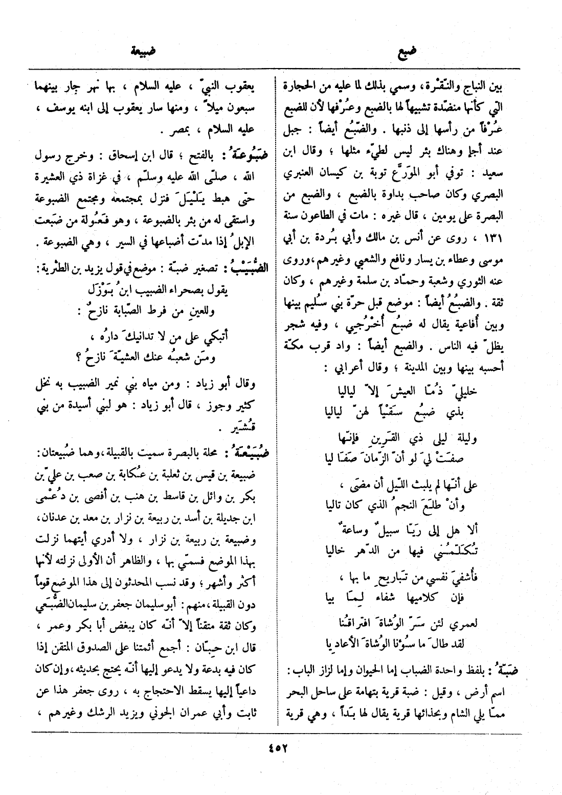 ضبيعة بن قيس بن ثعلبة بن عكابة بن صعب بن عليّ بن بكر بن وائل بن قاسط بن هنب بن أفصى بن دعمي ابن جديلة بن أسد بن ربيعة بن نزار بن معد بن عدنان، وضبيعة بن ربيعة بن نزار، ولا أدري أيتهما نزلت بهذا الموضع فسمّي بها، والظاهر أن الأولى نزلته لأنها أكثر وأشهر، وقد نسب المحدثون إلى هذا الموضع قوما دون القبيلة، منهم: أبو سليمان جعفر بن سليمان الضّبعي وكان ثقة متقنا إلّا أنّه كان يبغض أبا بكر وعمر، قال ابن حبّان: أجمع أئمتنا على الصدوق المتقن إذا كان فيه بدعة ولا يدعو إليها أنّه يحتج بحديثه، وإن كان داعيا إليها يسقط الاحتجاج به، روى جعفر هذا عن ثابت وأبي عمران الجوني ويزيد الرشك وغيرهم،