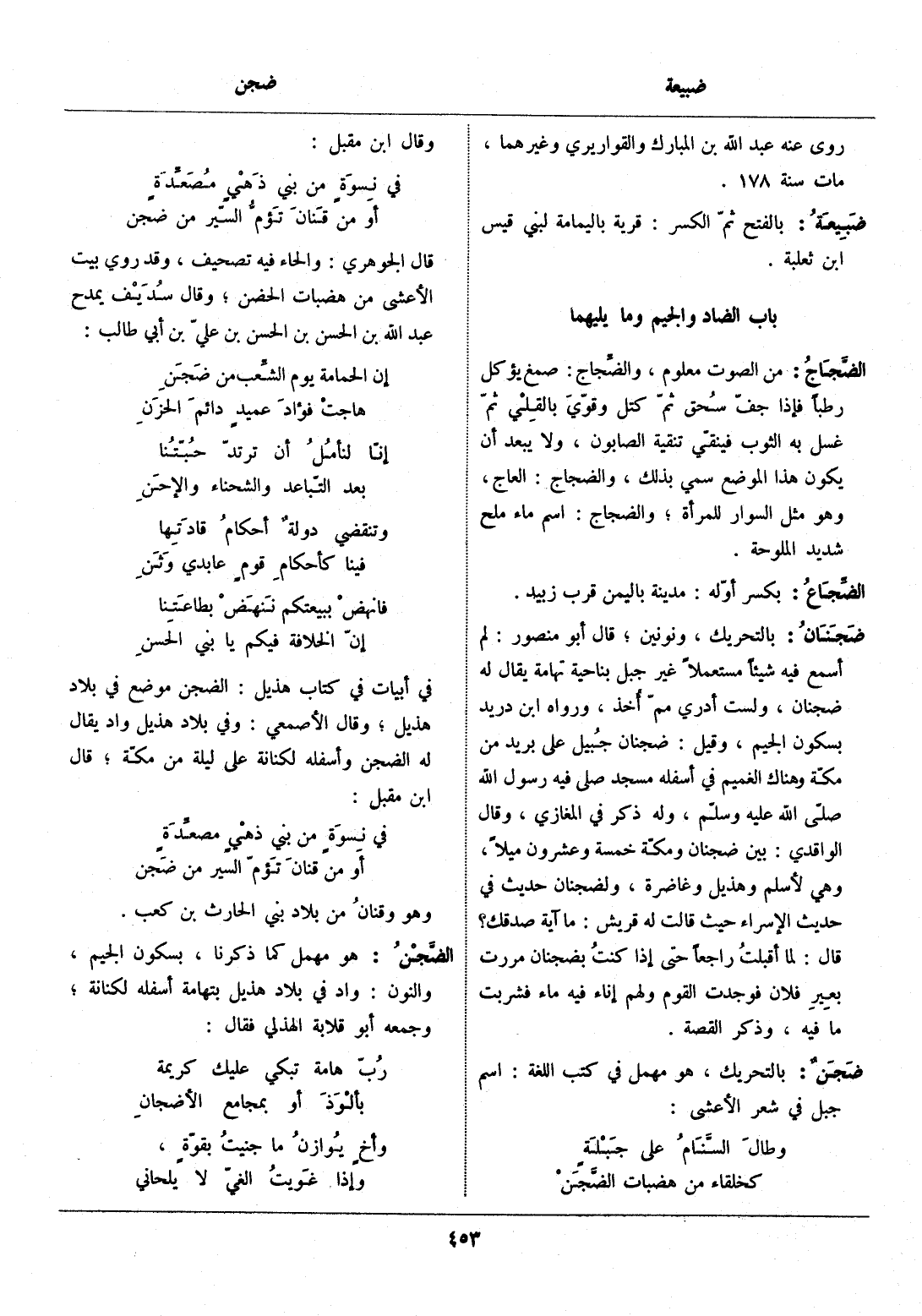 بالتحريك، ونونين، قال أبو منصور: لم أسمع فيه شيئا مستعملا غير جبل بناحية تهامة يقال له ضجنان، ولست أدري ممّ أخذ، ورواه ابن دريد بسكون الجيم، وقيل: ضجنان جبيل على بريد من مكّة وهناك الغميم في أسفله مسجد صلى فيه رسول الله صلّى الله عليه وسلّم، وله ذكر في المغازي، وقال الواقدي: بين ضجنان ومكّة خمسة وعشرون ميلا، وهي لأسلم وهذيل وغاضرة، ولضجنان حديث في حديث الإسراء حيث قالت له قريش: ما آية صدقك؟