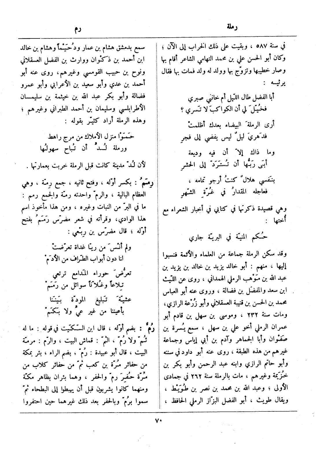 وقد سكن الرملة جماعة من العلماء والأئمة فنسبوا إليها، منهم: أبو خالد يزيد بن خالد بن يزيد بن عبد الله بن موهب الرملي الهمداني، روى عن اللّيث ابن سعد والمفضّل بن فضالة، وروى عنه أبو العباس محمد بن الحسن بن قتيبة العسقلاني وأبو زرعة الرازي، ومات سنة 232، وموسى بن سهل بن قادم أبو عمران الرملي أخو علي بن سهل، سمع يسرة بن صفوان وأبا الجماهر وآدم بن أبي إياس وجماعة غيرهم من هذه الطبقة، روى عنه أبو داود في سننه وأبو حاتم الرازي وابنه عبد الرحمن وأبو بكر بن خزيمة وغيرهم، مات بالرملة سنة 262 في جمادى الأولى، وعبد الله بن محمد بن نصر بن طويط، ويقال طويث، أبو الفضل البزّاز الرملي الحافظ، سمع بدمشق هشام بن عمار ودحيما وهشام بن خالد ابن أحمد بن ذكوان ووارث بن الفضل العسقلاني ونوح بن حبيب القومسي وغيرهم، روى عنه أبو أحمد بن عدي وأبو سعيد بن الأعرابي وأبو عمرو فضالة وأبو بكر عبد الله بن خيثمة بن سليمان الأطرابلسي وسليمان بن أحمد الطبراني وغيرهم، وهذه الرملة أراد كثيّر بقوله: