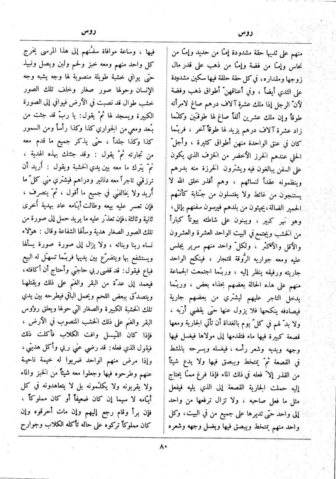 منهم على ثديها حقة مشدودة إمّا من حديد وإمّا من نحاس وإمّا من فضة وإمّا من ذهب على قدر مال زوجها ومقداره، في كل حقة حلقة فيها سكين مشدودة على الثدي أيضا، وفي أعناقهنّ أطواق ذهب وفضة لأنّ الرجل إذا ملك عشرة آلاف درهم صاغ لامرأته طوقا وإن ملك عشرين ألفا صاغ لها طوقين وكلّما زاد عشرة آلاف درهم يزيد لها طوقا آخر، فربّما كان في عنق الواحدة منهن أطواق كثيرة، وأجلّ الحلي عندهم الخرز الأخضر من الخزف الذي يكون على السفن يبالغون فيه ويشترون الخرزة منه بدرهم وينظمونه عقدا لنسائهم، وهم أقذر خلق الله لا يستنجون من غائط ولا يغتسلون من جنابة كأنّهم الحمير الضالة، يجيئون من بلدهم فيرسون سفنهم بإتل، وهو نهر كبير، ويبنون على شاطئه بيوتا كبارا من الخشب ويجتمع في البيت الواحد العشرة والعشرون والأقل والأكثر، ولكلّ واحد منهم سرير يجلس عليه ومعه جواريه الرّوقة للتجار، فينكح الواحد جاريته ورفيقه ينظر إليه، وربّما اجتمعت الجماعة منهم على هذه الحالة بعضهم بحذاء بعض، وربّما يدخل التاجر عليهم ليشتري من بعضهم جارية فيصادفه ينكحها فلا يزول عنها حتى يقضي أربه، ولا بدّ لهم في كلّ يوم بالغداة أن تأتي الجارية ومعها قصعة كبيرة فيها ماء فتقدمها إلى مولاها فيغسل فيها وجهه ويديه وشعر رأسه، فيغسله ويسرحه بالمشط في القصعة ثمّ يمتخط ويبصق فيها ولا يدع شيئا من القذر إلّا فعله في ذلك الماء فإذا فرغ ممّا يحتاج إليه حملت الجارية القصعة إلى الذي يليه فيفعل مثل ما فعل صاحبه، ولا تزال ترفعها من واحد إلى واحد حتى تديرها على جميع من في البيت، وكل واحد منهم يمتخط ويبصق فيها ويغسل وجهه وشعره فيها، وساعة موافاة سفنهم إلى هذا المرسى يخرج كل واحد منهم ومعه خبز ولحم ولبن وبصل ونبيذ حتى يوافي خشبة طويلة منصوبة لها وجه يشبه وجه الإنسان وحولها صور صغار وخلف تلك الصور خشب طوال قد نصبت في الأرض فيوافي إلى الصورة الكبيرة ويسجد لها ثمّ يقول: يا ربّ قد جئت من بعد ومعي من الجواري كذا وكذا رأسا ومن السمور كذا وكذا جلدا، حتى يذكر جميع ما قدم معه من تجارته ثمّ يقول: وقد جئتك بهذه الهدية، ثمّ يترك ما معه بين يدي الخشبة ويقول: أريد أن ترزقني تاجرا معه دنانير ودراهم فيشتري مني كلّ ما أريد ولا يخالفني في جميع ما أقول، ثمّ ينصرف، فإن تعسر عليه بيعه وطالت أيّامه عاد بهدية أخرى ثانية وثالثة، فإن تعذّر عليه ما يريد حمل إلى صورة من تلك الصور الصغار هدية وسألها الشفاعة وقال: هؤلاء نساء ربنا وبناته، ولا يزال إلى صورة صورة يسألها ويستشفع بها ويتضرّع بين يديها فربّما تسهّل له البيع فباع فيقول: قد قضى ربي حاجتي وأحتاج أن أكافئه، فيعمد إلى عدّة من البقر والغنم على ذلك ويقتلها ويتصدّق ببعض اللحم ويحمل الباقي فيطرحه بين يدي تلك الخشبة الكبيرة والصغار التي حولها ويعلق رؤوس البقر والغنم على ذلك الخشب المنصوب في الأرض، فإذا كان اللّيل وافت الكلاب فأكلت ذلك فيقول الذي فعله: قد رضي عني ربي وأكل هديتي، وإذا مرض منهم الواحد ضربوا له خيمة ناحية عنهم وطرحوه فيها وجعلوا معه شيئا من الخبز والماء ولا يقربونه ولا يكلّمونه بل لا يتعاهدونه في كل أيّامه لا سيما إن كان ضعيفا أو كان مملوكا، فإن برأ وقام رجع إليهم وإن مات أحرقوه وإن كان مملوكا تركوه على حاله تأكله الكلاب وجوارح