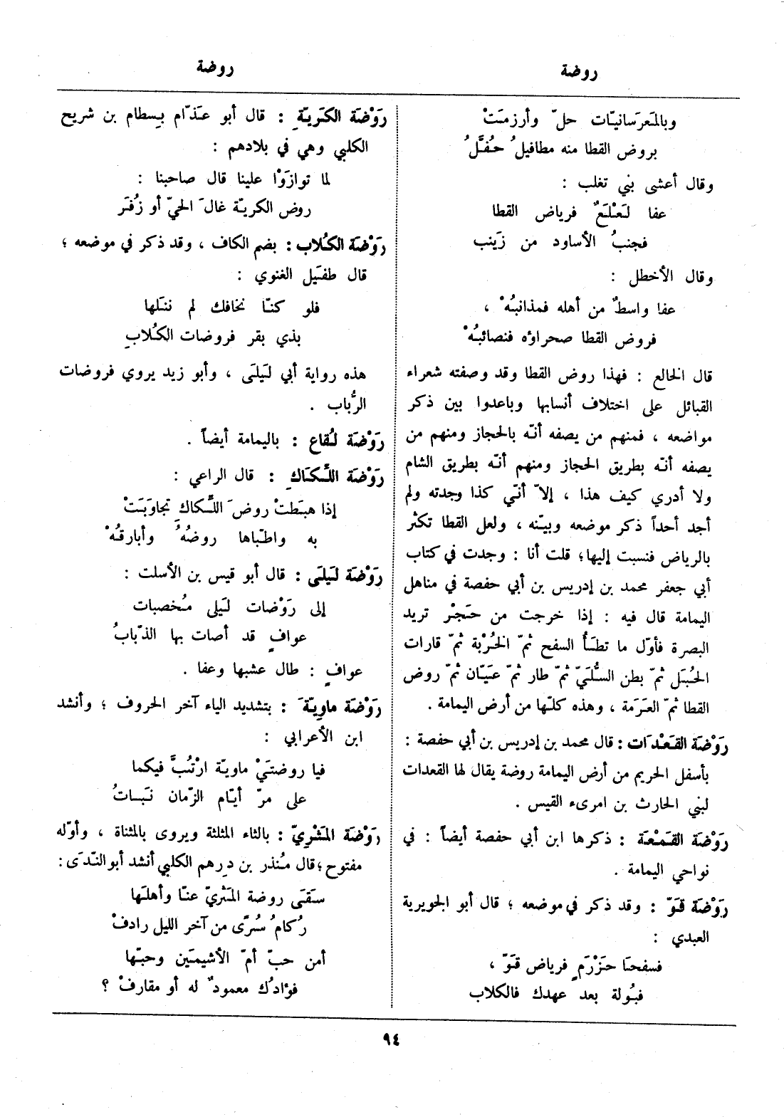 قال الخالع: فهذا روض القطا وقد وصفته شعراء القبائل على اختلاف أنسابها وباعدوا بين ذكر مواضعه، فمنهم من يصفه أنّه بالحجاز ومنهم من يصفه أنّه بطريق الحجاز ومنهم أنّه بطريق الشام ولا أدري كيف هذا، إلّا أنّي كذا وجدته ولم أجد أحدا ذكر موضعه وبيّنه، ولعل القطا تكثر بالرياض فنسبت إليها، قلت أنا: وجدت في كتاب أبي جعفر محمد بن إدريس بن أبي حفصة في مناهل اليمامة قال فيه: إذا خرجت من حجر تريد البصرة فأوّل ما تطأ السفح ثمّ الخربة ثمّ قارات الحبل ثمّ بطن السّليّ ثمّ طار ثمّ عيّان ثمّ روض القطا ثمّ العرمة، وهذه كلّها من أرض اليمامة.