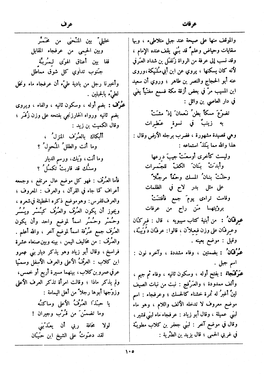 فأما العرف: فهو كل موضع عال مرتفع، وجمعه أعراف كما جاء في القرآن، والعرف: المعروف، والعرف للفرس: وهو موضع ذكره الحطيئة في شعره، ويجوز أن يكون العرف والعرف كيسر ويسر وحمر وحمر اسما لموضع واحد وأن يكون العرف جمع عرفة اسما لموضع آخر، والله أعلم.