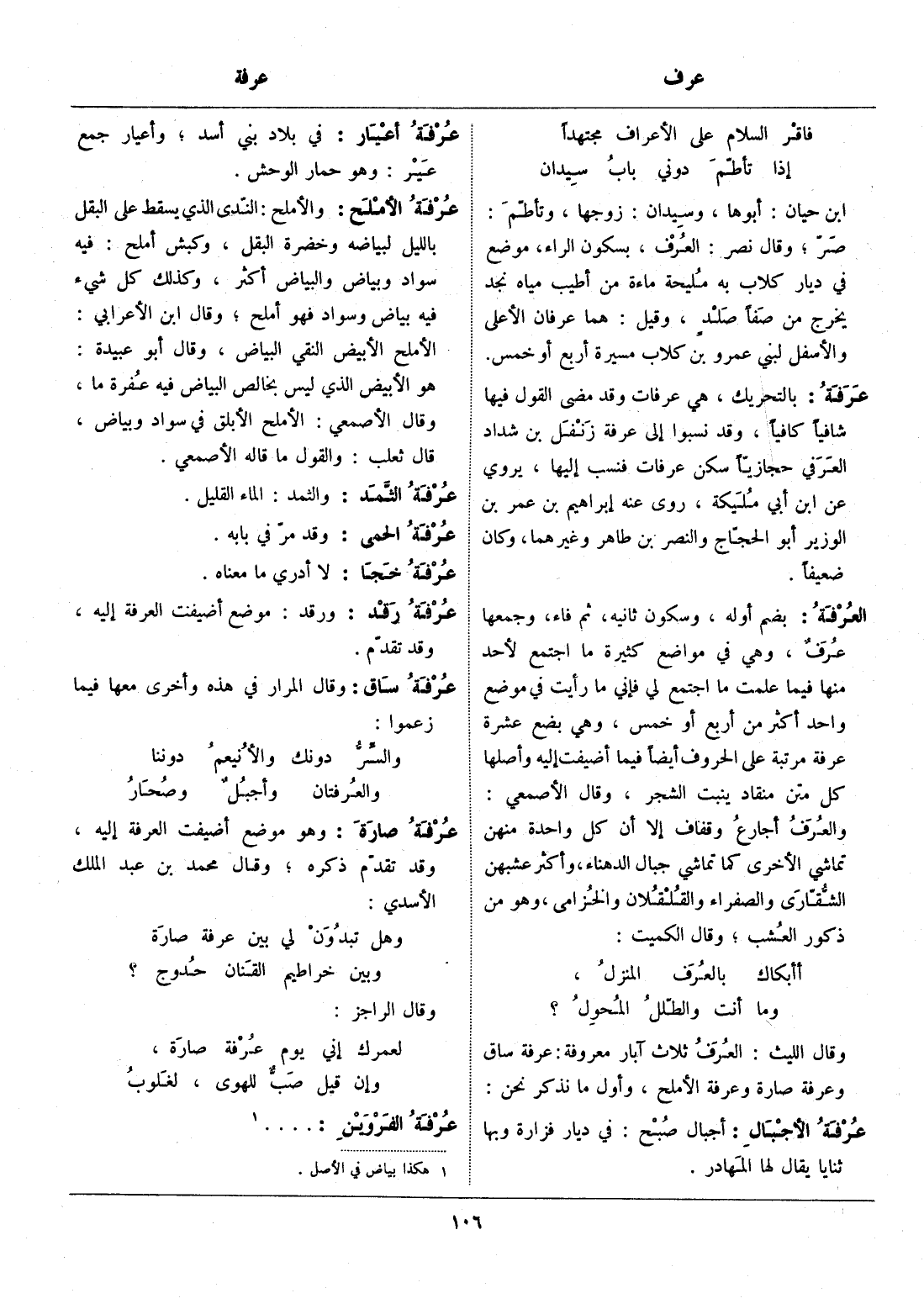وقال الليث: العرف ثلاث آبار معروفة: عرفة ساق وعرفة صارة وعرفة الأملح، وأول ما نذكر نحن: